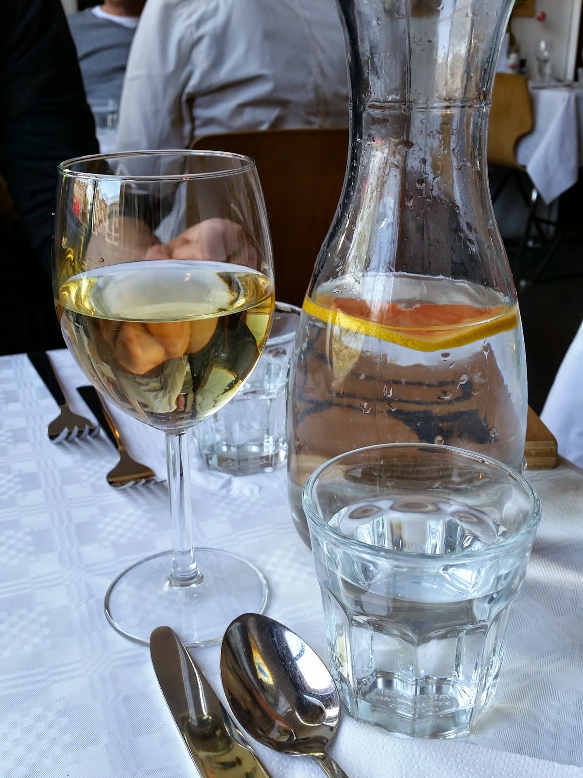 wino z „odzysku” (około 3,00 EUR za kieliszek) oraz woda z kranu