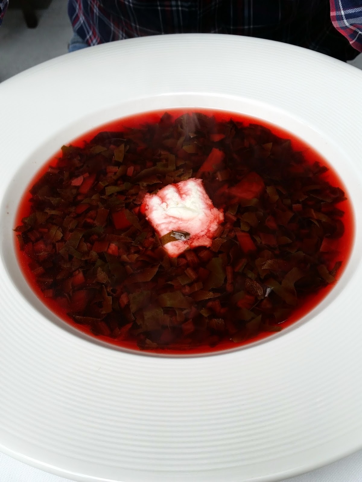 Mój towarzysz, najedzony już wcześniej, zamówił jedynie barszcz (7,00) – zupę dostępną tego dnia w ofercie lunchowej. Przyrządzoną z młodej boćwiny i doprawioną łyżką śmietany. Wyglądało na to, że smakowała – szybko zniknęła z talerza.