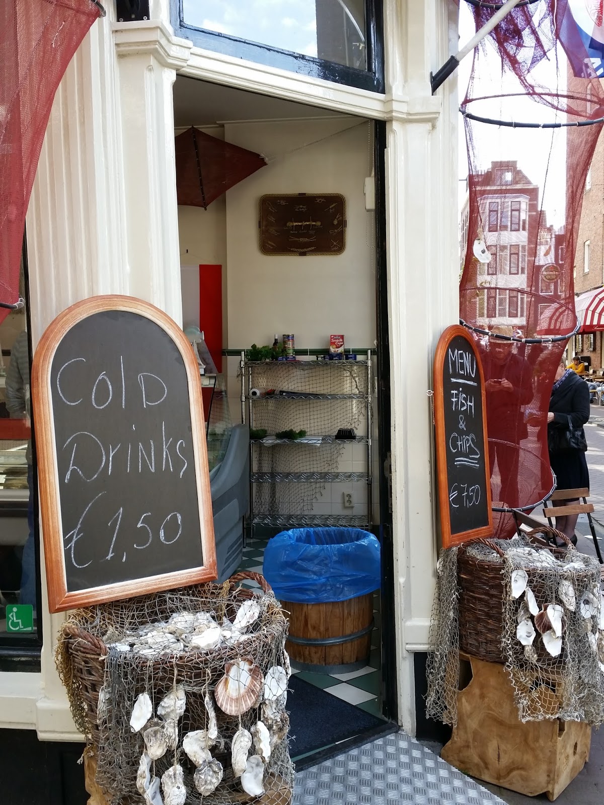 inna wersja seafood w Amsterdamie – węgorz| łosoś | krewetki (9,00 EUR za porcję) – w niewielkim sklepie z rybami na rogu ul. Egelantiersstraat i Tweede Egelantiersstraat. Vis a vis sklepu znajdziecie restaurację Oliva pintxos y vinos – wpadnijcie tu na lampkę wina.