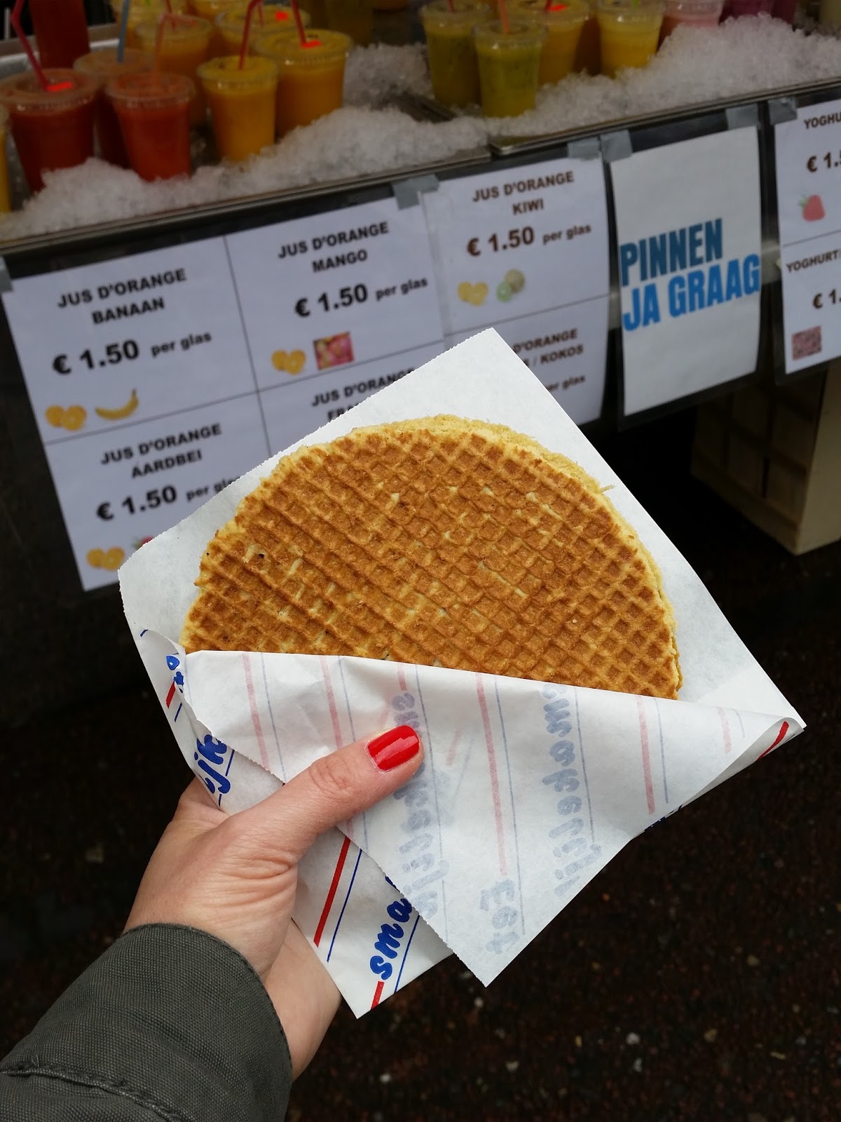 Kolejny amsterdamski przysmak to wafle z tofi – stroopwafel (1,50 – 2,00 EUR) – oczywiście najlepsze są te przygotowywane na świeżo. Ja idealnego wafla (jeszcze ciepłego z ciągnącym się karmelem) znalazłam na targu Albert Cuyp Market (na ulicy o tej samej nazwie na południu od centrum Amsterdamu). Miejsce zasługuje na odwiedzenie – znajdziecie tu mnóstwo straganów z owocami, warzywami, serami i to co nas zachwyciło – ze świeżo wyciskanymi sokami.