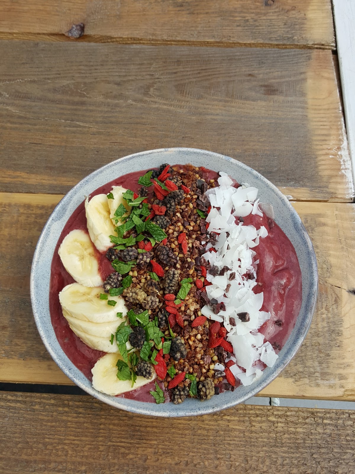 Już na wynos zabraliśmy smoothies antioxidant (19,00 – mniejsza porcja) – banan, jagoda, jeżyny, chia, limonka, imbir. Jak na jagody i jeżyny przystało była to rakieta witamin i antyoksydantów:)