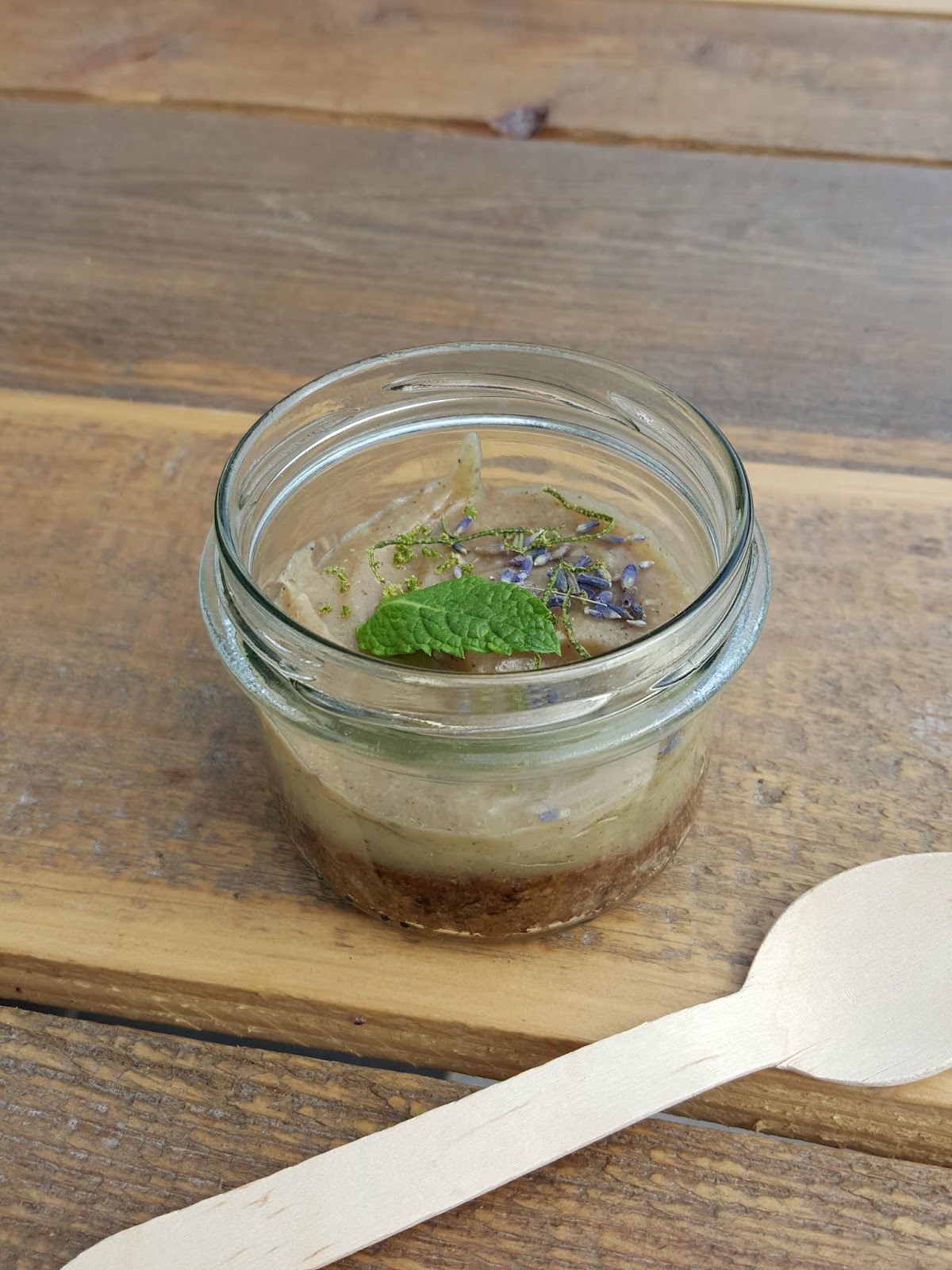 Ja wybieram sernik vege z orzechów nerkowca (15,00) z limonką oraz suszoną lawendą – ta niewielka, bardzo aromatyczna porcja zabiła mnie swoją słodyczą a do tego okazała się być niezwykle sycąca i zapychająca, także nie przejmujcie się malutkim słoiczkiem w którym sernik jest podawany – to jest porcja killer:)