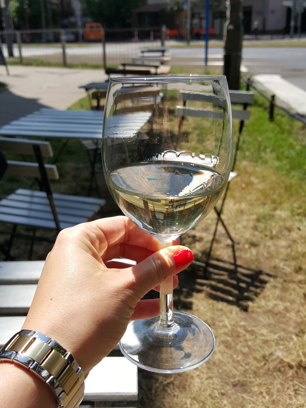 ja tego dnia raczyłam się hiszpańskim sauvignon blanc (9,00 za kieliszek) – lekko owocowym ale z przewagą cytrusów oraz winem domowym (8,00 zł za kieliszek), które okazało się być równie dobre i orzeźwiające w ten upalny dzień.