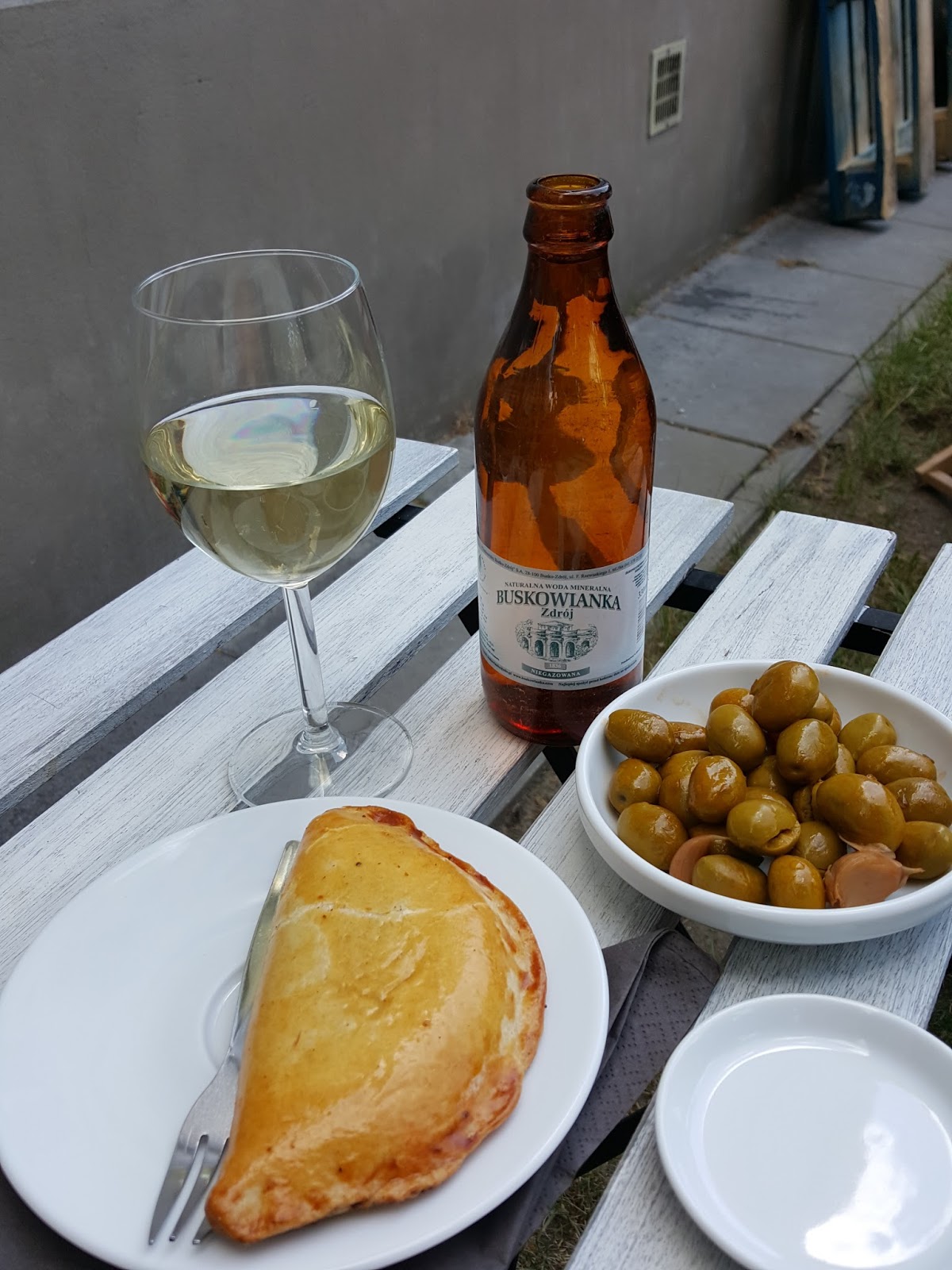a do wina – empanadilla z farszem z tuńczyka, pomidorów i papryki (6,00) oraz wyśmienite oliwki z czosnkiem (9,00) – smaczne przekąski do wina i nie tylko:)