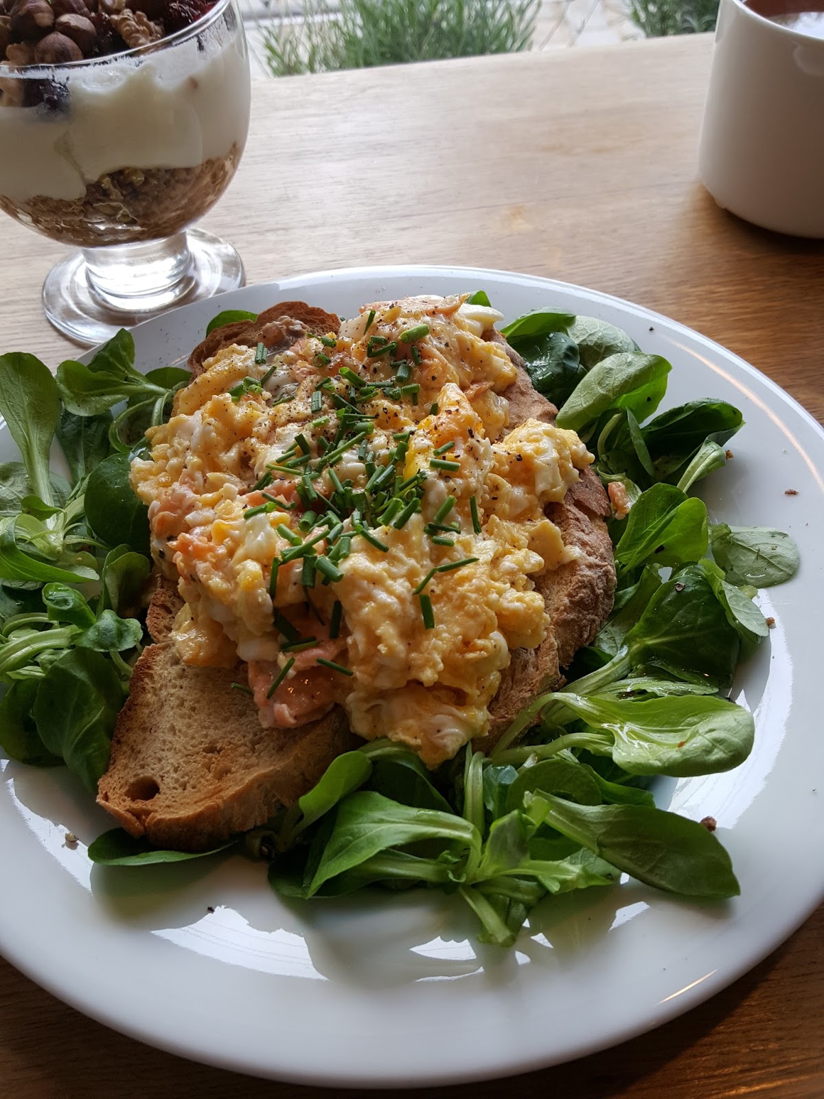 Ja zdecydowałam się na jajecznicę z wędzonym łososiem (15,00) – która przygotowana została z 3 jaj i podana na dwóch grzankach oraz sporej ilości roszponki (dobrze:). Porcja była olbrzymia i ledwo jej podołałam. A w smaku – pychota