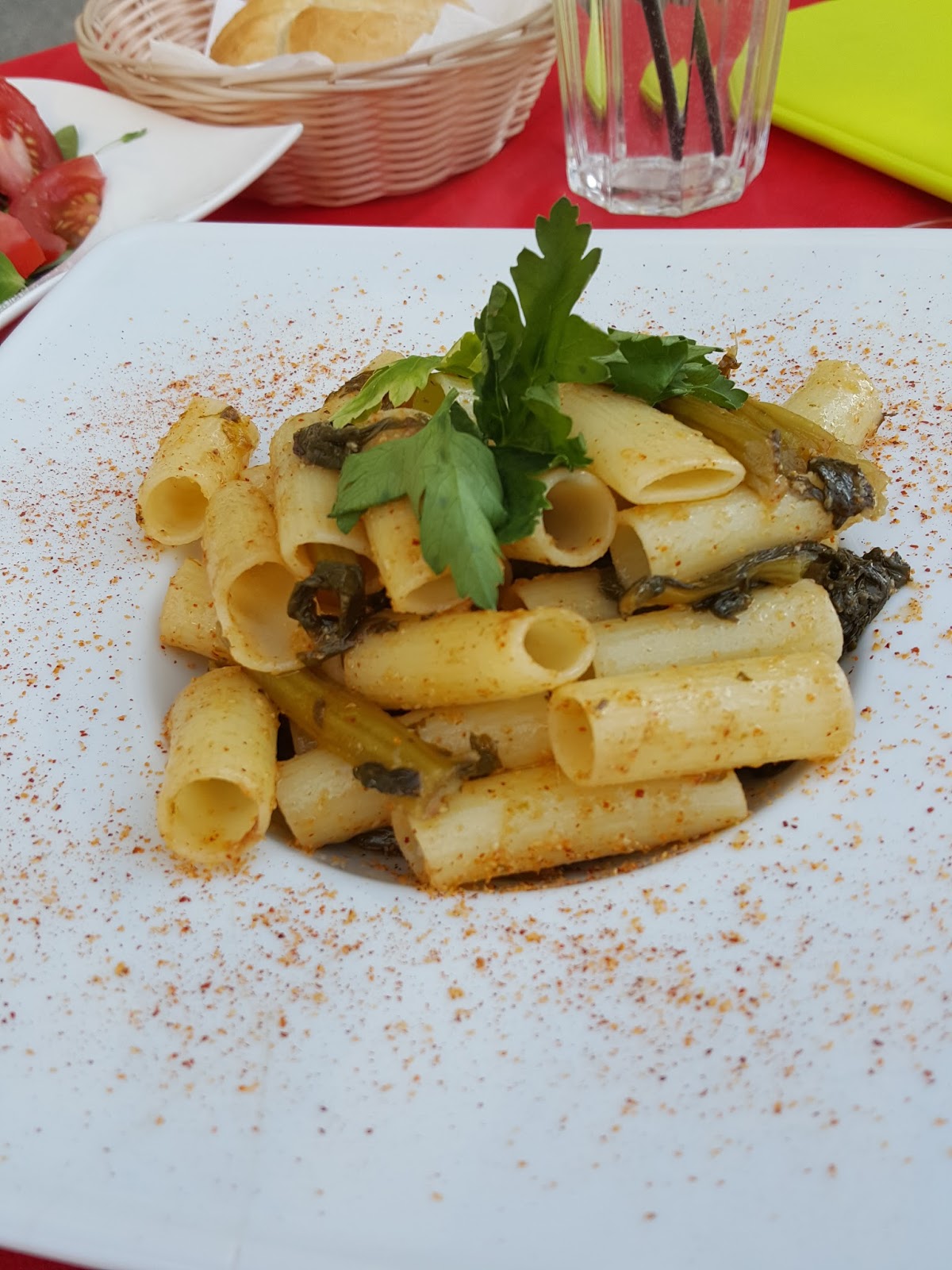 Z krótkiego menu wybrałam pastę, dla której w końcu przyszłam tu tego dnia, orecchiette friarielli (24,00) – czyli makaron (tu akurat zamiast orecchiette zamówiłam bezglutenowy rigatoni) z marynowaną kapustą polną (zwaną również rapini czy brocoletti di rape). Już po kilku minutach na stole pojawiła się pasta, która niestety okazała się niedogotowanym makaronem z niewielką ilością wspomnianej kapusty. Na moją prośbę danie (makaron) zostało przygotowane ponownie – tym razem już poprawnie. Marynowana kapusta polna w smaku lekko przypomina nasze kiszonki – jest wyraźna i muszę przyznać smaczna:) Całe danie podkręcone zostało papryką chilli.