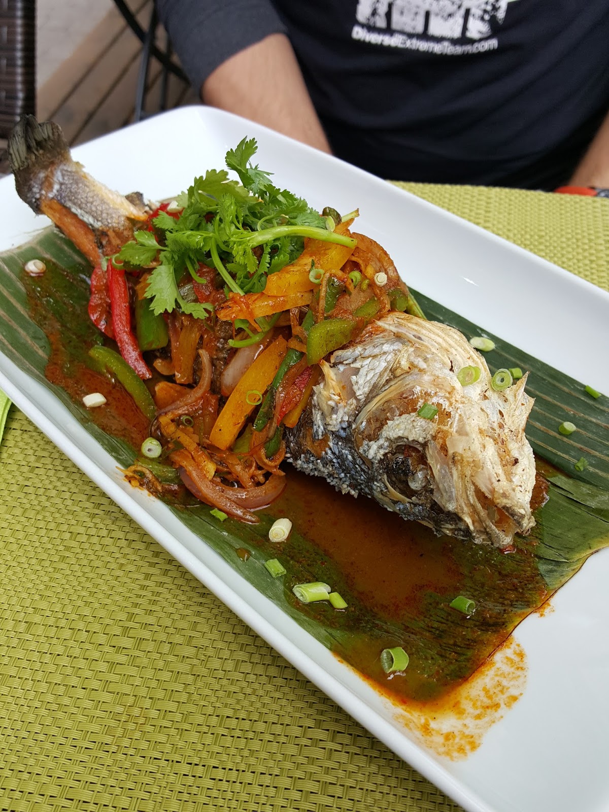 Kolejnym wyborem M był smażony labraks – pla tod rad prik khing (43,00) podany w słodkim sosie z pasty curry z czerwoną papryką i fasolką szparagową. Ryba przesiąkła aromatycznymi tajskimi przyprawami – była pyszna