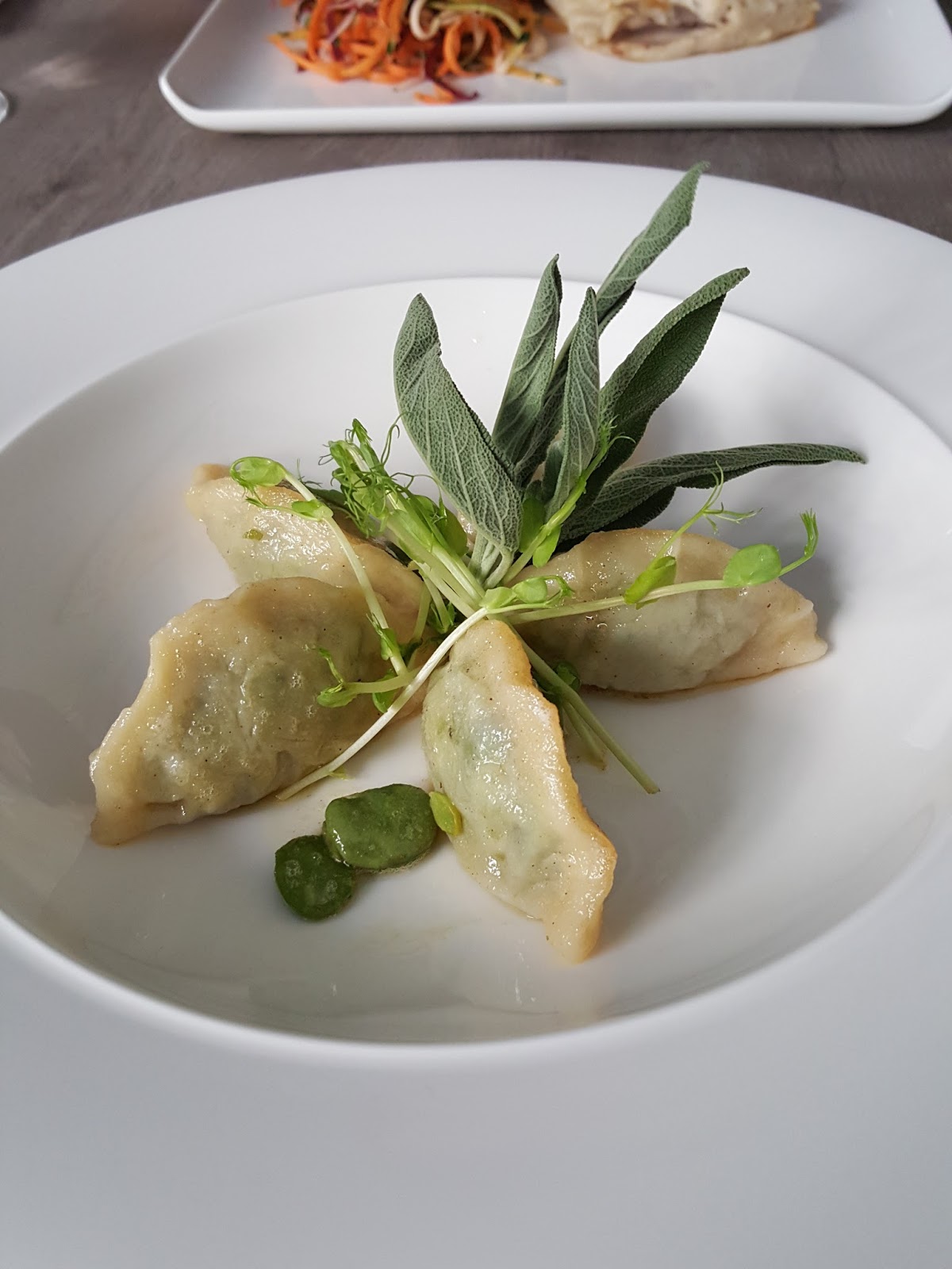 Ja skusiłam się na pierogi z bobem i szałwią (30,00) – cienkie ciasto wypełniono sowicie farszem z bobu. Muszę przyznać, że taka wersja pierogów bardzo przypadła mi do gustu.