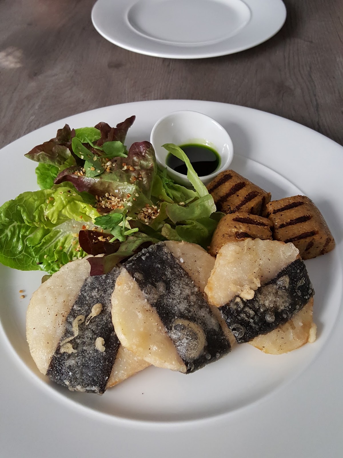 Z karty wybieramy danie wegańskie – chrupiący seler smażony w mące ryżowej z paskami nori, podany z polentą z żołędzi oraz liśćmi sałaty (35,00). To pozycja z sekcji dania główne – nam służyła za przystawkę. Seler był chrupiący i słodki, polenta mięsista i delikatna w smaku. Polecamy.