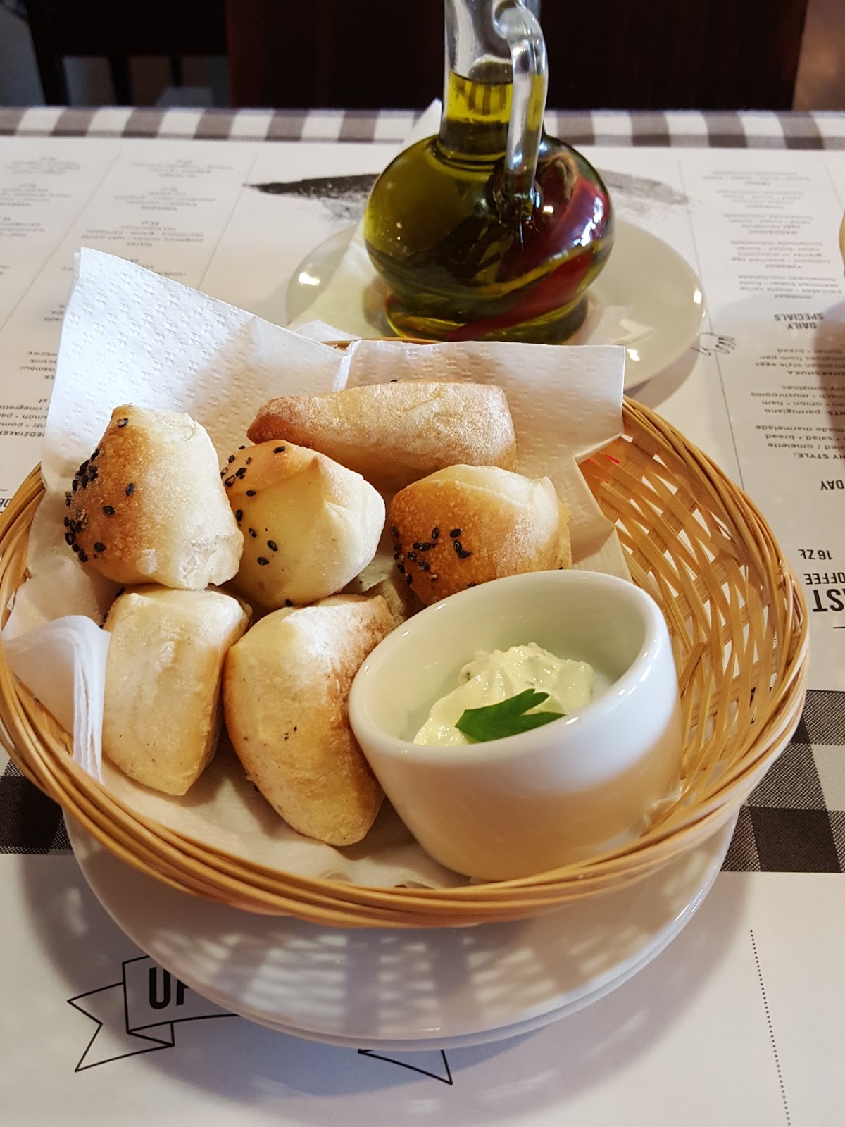 Na start podano czekadełko – świeże bułeczki z oliwą i masłem. A ponieważ głód już bardzo mi doskwierał, a na zamówione dania przyszło mi czekać ponad 25 minut, skusiłam się na nie.