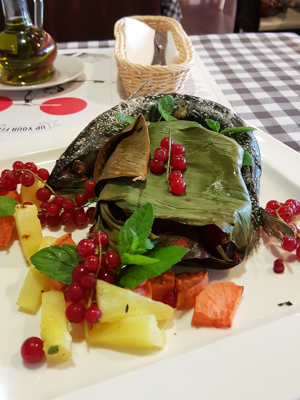 W przeciwieństwie do pieczonej makreli (39,00), która wyglądała widowiskowo podana w towarzystwie owoców i warzyw, jednak okazała się zimna w środku i niedopieczona. Do tego zawinięte w liść bananowca warzywa (marchewka, papryka, cukinia) były zbyt twarde (do al dente było im jeszcze daleko).