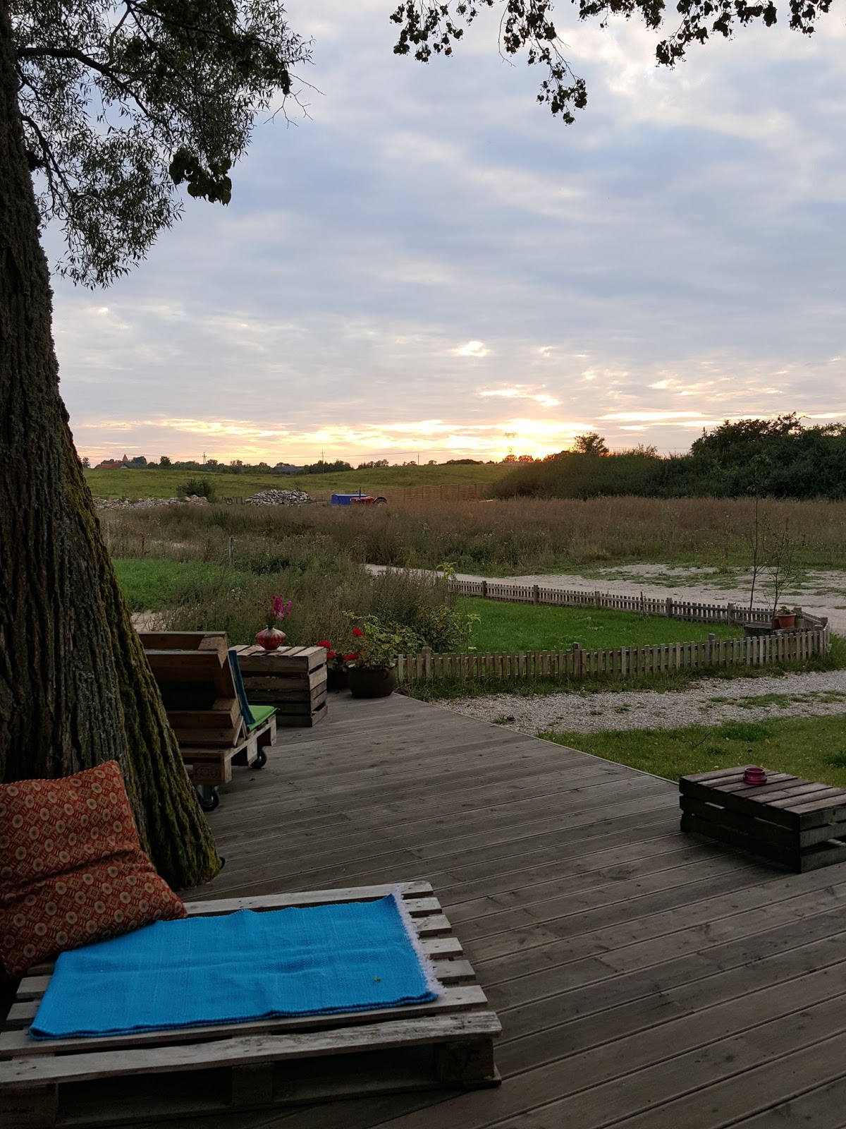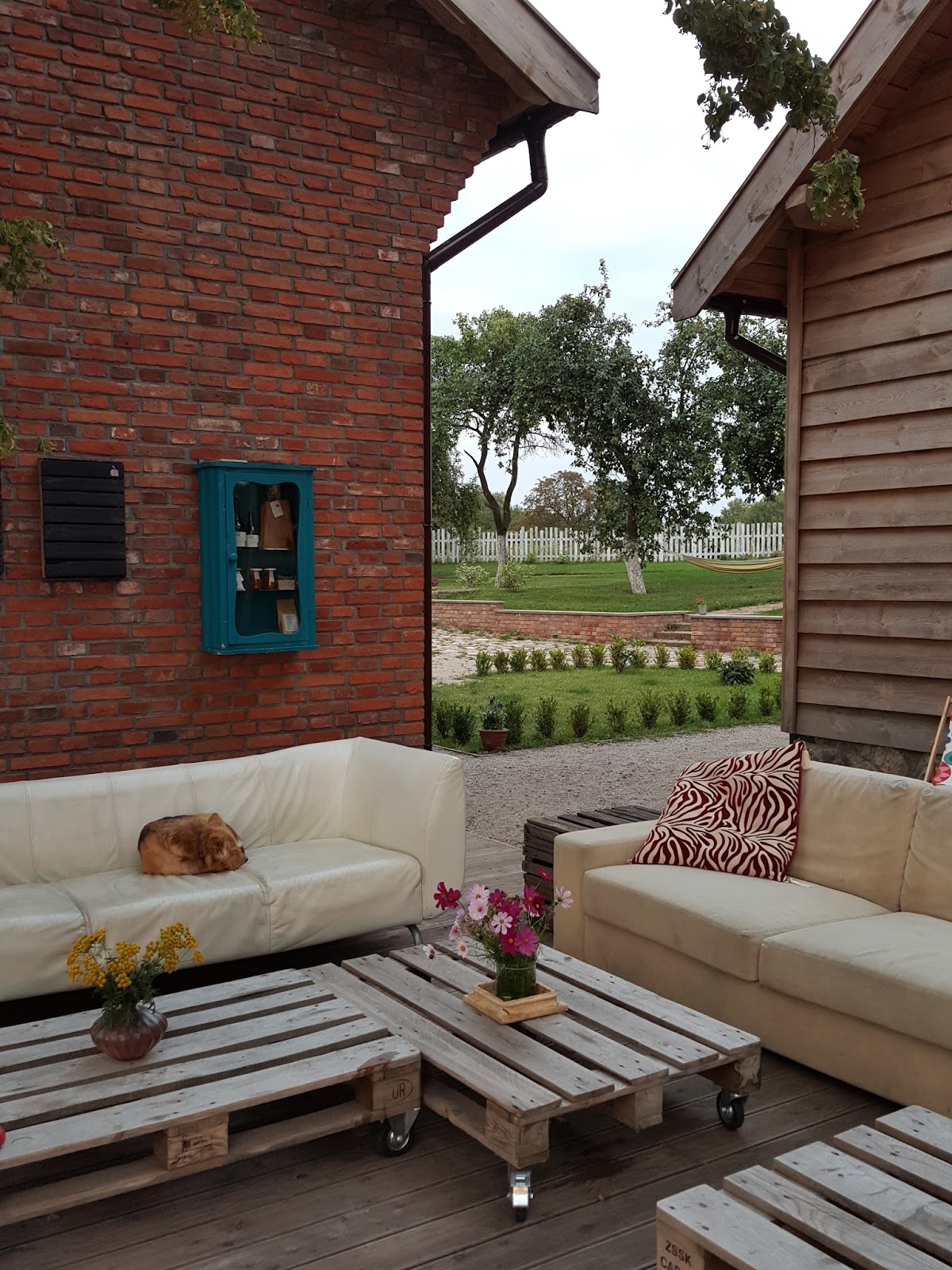 Tuż po przyjeździe powitał nas taki oto widok na nowo wybudowany dom „mieszkalny” – w nim znajdują się pokoje dla gości oraz kuchnia z wielkim drewnianym stołem pełnym nasadzonych w nim kwiatów:) Obok domu wybudowano cydrownię.