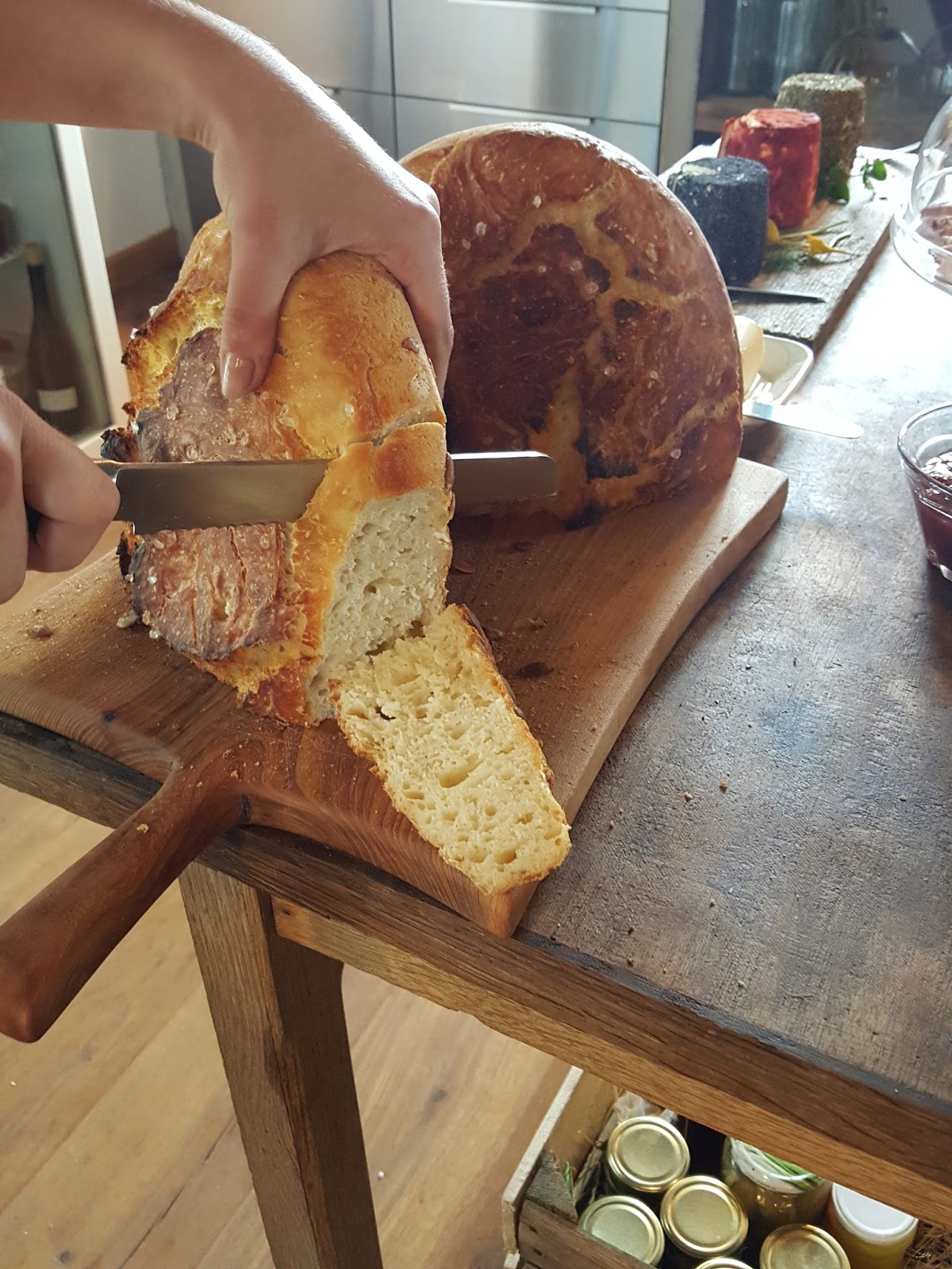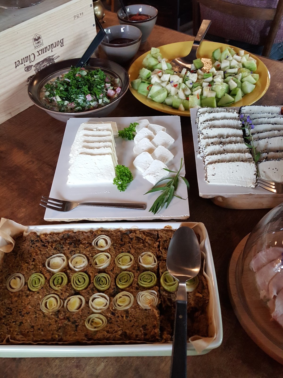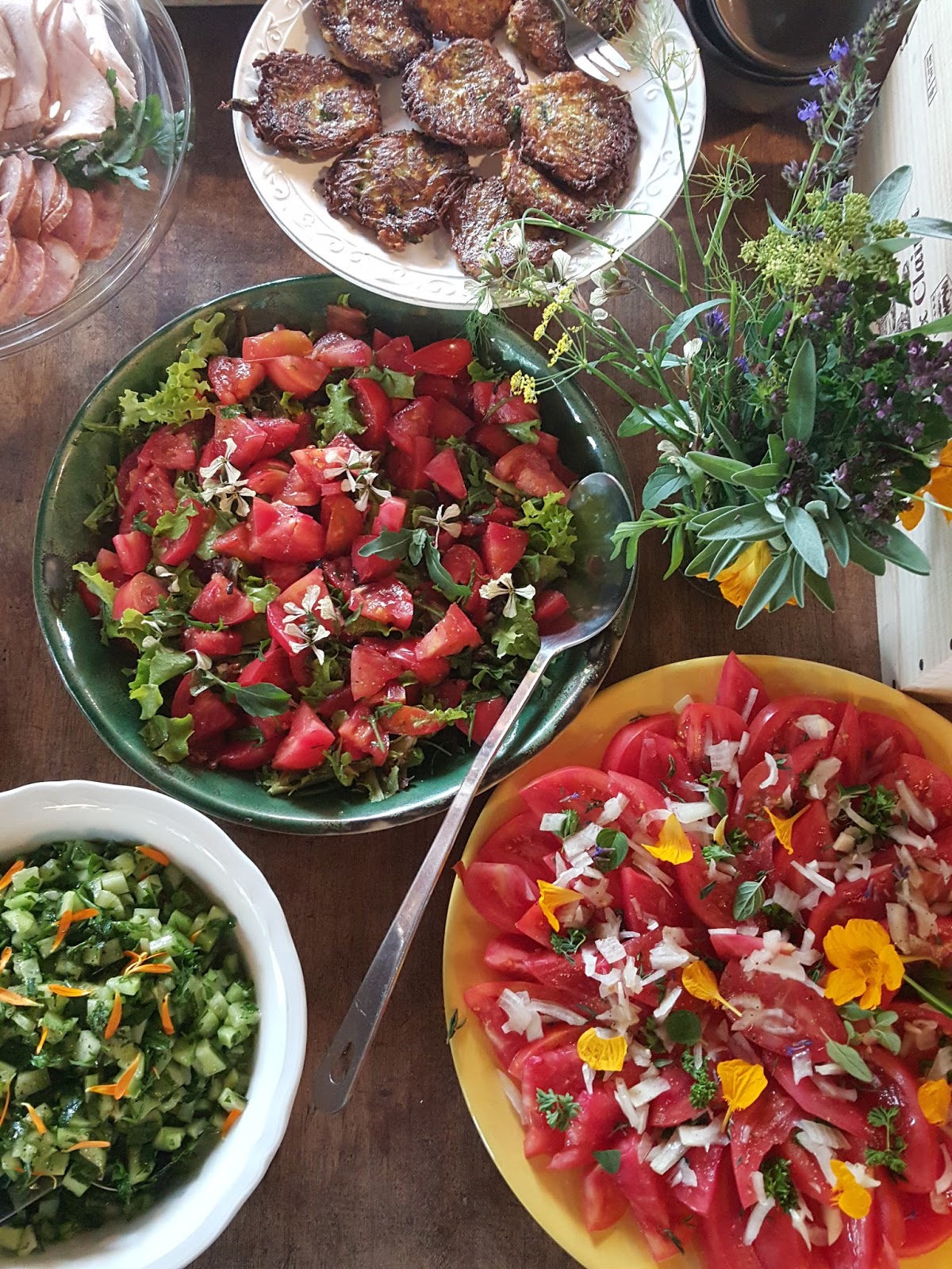 Po tak obfitej i smacznej kolacji głód z rana wyjątkowo mi doskwierał – na szczęście śniadanie od 09:00 było już gotowe i tylko czekało na pierwszych chętnych czyli mnie – wielkiego głodomora. Sery, świeżo pieczony chleb, pachnące latem sałatki z pomidorów i ziół, placuszki z cukinii, wegański pasztet – nie mogłam się im oprzeć. Na szczęście w Kwaśnym Jabłku spędziliśmy dwie noce co oznaczało dwa tak wyśmienite śniadania:)