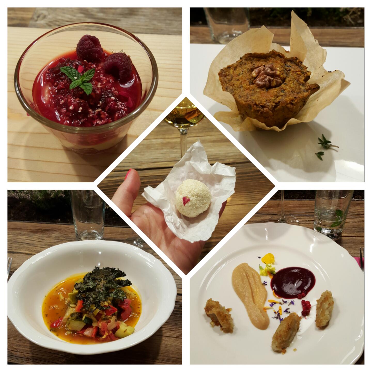 Kolację rozpoczęło leczo warzywne z warzyw zebranych z pobliskiego pola, po nim podano wytrawną i pikantną warzywną babeczkę. Pieczony jeleń był kolejną pozycją, na moim talerzu znalazły się jedynie lekko kwaśny mus jabłkowy, wyraźny w smaku, lekko gorzki sos z borówek brusznic oraz kluski. Ucztę zamykały desery – owoce z kaszą oraz kulka z mąki gryczanej. Do każdego dania serwowane było wino – prawdziwy food and wine pairing.