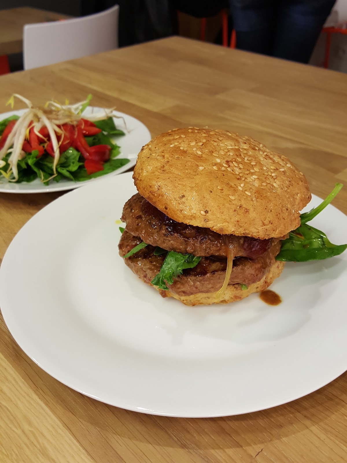 Tego dnia moim towarzyszem w czasie lunchu był znajomy, który w kwestiach jedzenia i treningów ma bardziej radykalne podejście od mojego. Jego wyborem był KIK Burger wołowy z podwójną porcją mięsa, jak się okazało zupełnie pozbawiony smaku oraz warzywa dnia, podane na mikro talerzyku.