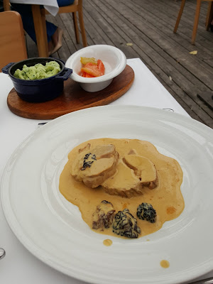Mój towarzysz skusił się na zupę rybną oraz pieczeń cielęcą podaną w sosie ze smardzami (62,00) – kolejny raz na stół wjechał gar, z którego obsługa nakładała kolejne porcje mięsa. Z opisu wrażeń jedzącego wnioskowałam, że danie przygotowane zostało pierwszorzędnie.