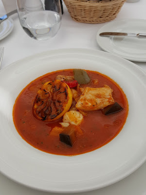 Jak tylko ją wypatrzyłam musiałam zamówić – zupa rybna a la bouillabaisse (48,00) – za tą cenę dostaniecie wielki żeliwny garnek wypełniony przepyszną zupą pełną kawałków ryby, krewetek i warzyw. Warto zamówić ale jest to porcja bardziej do podziału na dwie osoby niż dla jednej. W garnku znajduje się około trzech talerzy:)