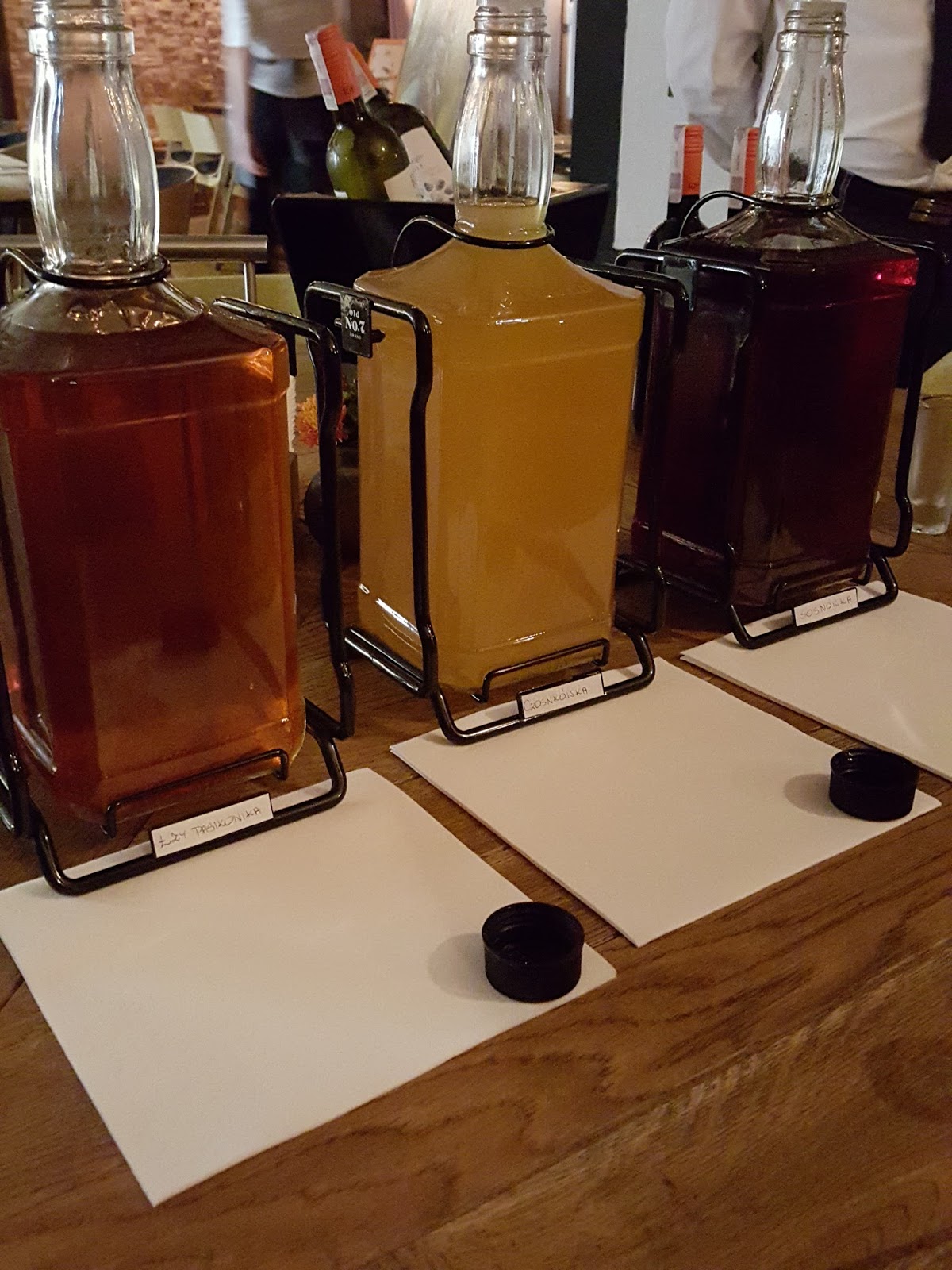 Po wizycie w Zamku przyszła kolej na kolację w Spiżarni, którą rozpoczęła degustacja nalewek (i dobrze, bo deszcz nas złapał podczas powrotu i przydało się coś na rozgrzanie). Była Czosnkówka (nie miałam odwagi jej spróbować), Łzy Pasikonika z cynamonem (to był mój faworyt) oraz Sosnówka o silnie żywicznym zapachu i smaku.
