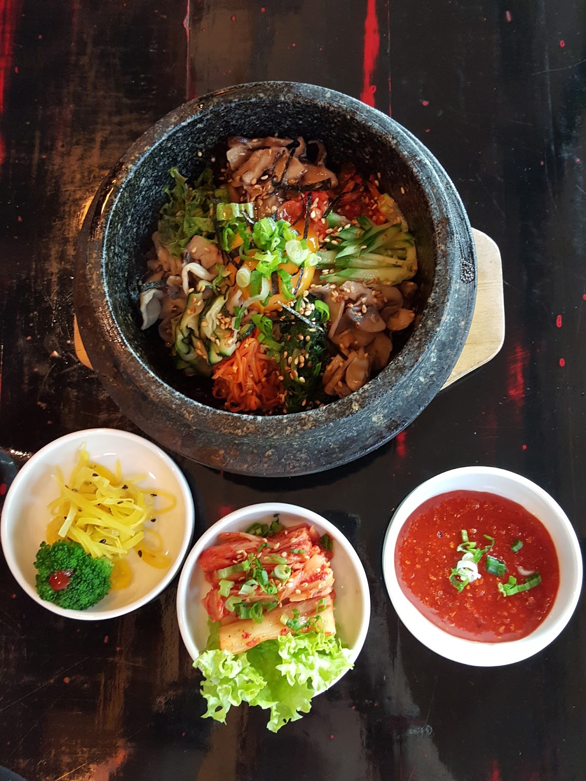 Wizyta w KIKU była również doskonałą okazją do zamówienia bibimbap (55,00) – skwierczących na ryżu w kamiennym naczyniu warzyw, grzybów oraz jajka – uwielbiam. Do dania serwowana jest dodatkowo zupa z pasty miso.