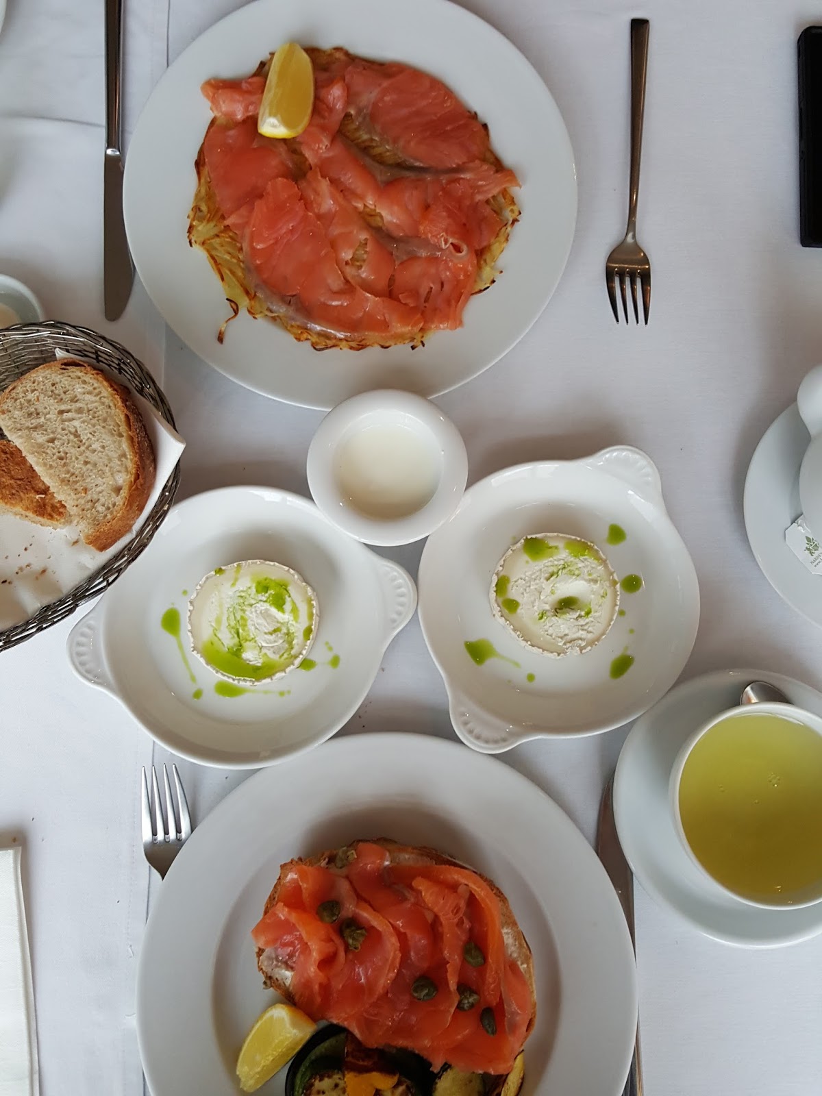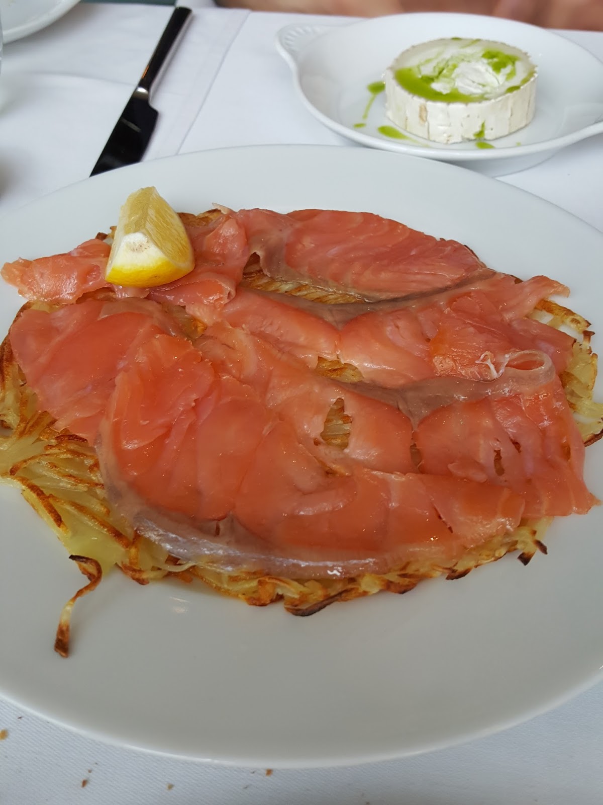 M w menu wypatrzył placek ziemniaczany Rosti z łososiem i wiejską śmietaną (25,00). Próbowałam, był rewelacyjny – cieniutki, z grubo tartych ziemniaków, z minimalną ilością oleju. Z łososiem smakował wybornie. A dodatkowy kozi ser nadał daniu wyrazistości.