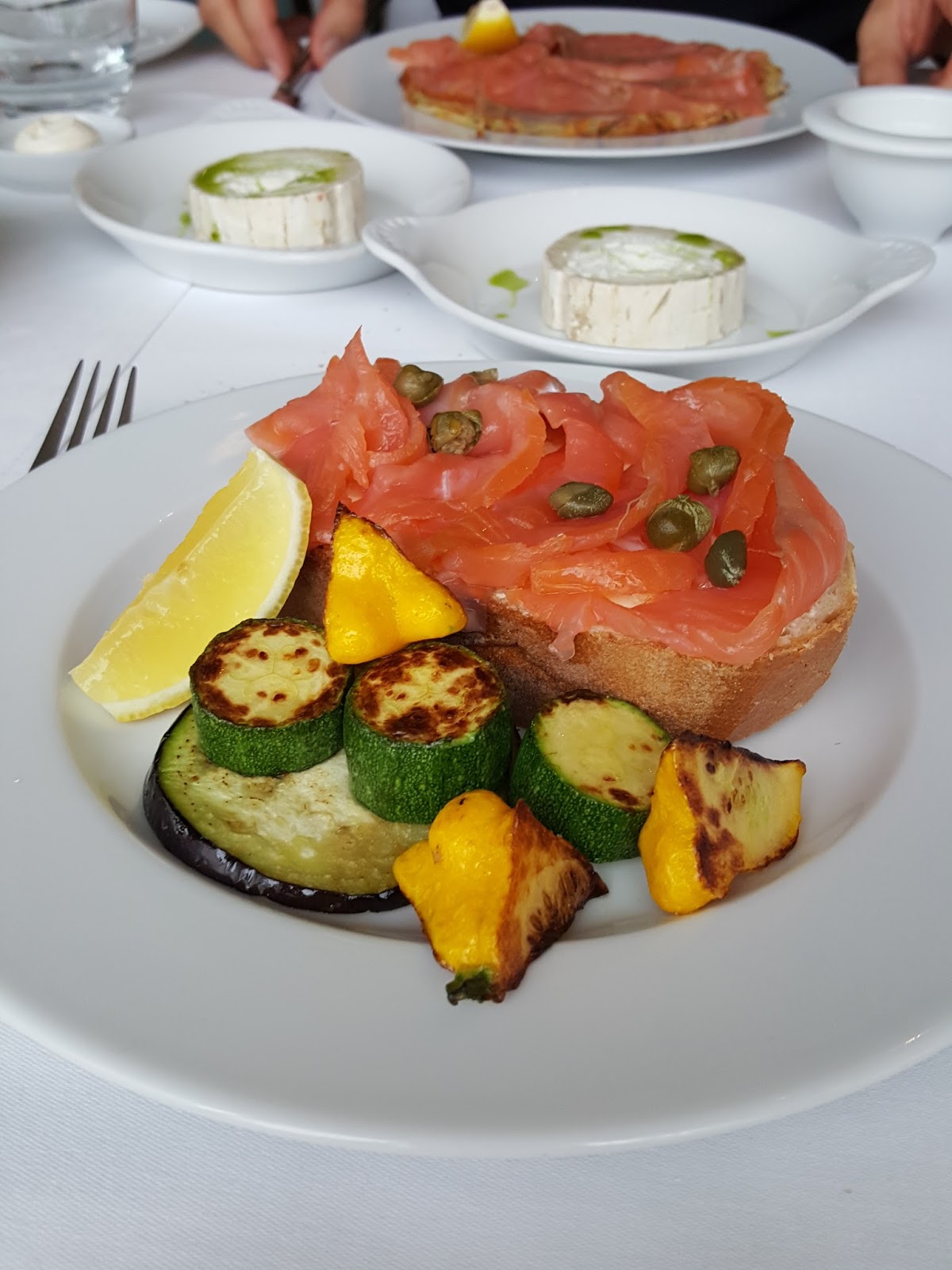 W końcu wybrałam – skusiła mnie kanapka z wędzonym łososiem i kaparami (18,00), która okazała się wielką pajdą chleba sowicie posmarowanego białym serkiem oraz przykryta porządnym plastrem łososia. Do kanapki zamówiłam dodatkowo grillowane warzywa (2,00 – zdziwiła mnie ta pozycja na rachunku – byłam przekonana, że wybrałam warzywa za 7,00) oraz kozi twaróg (8,00). To było bardzo dobre połączenie.