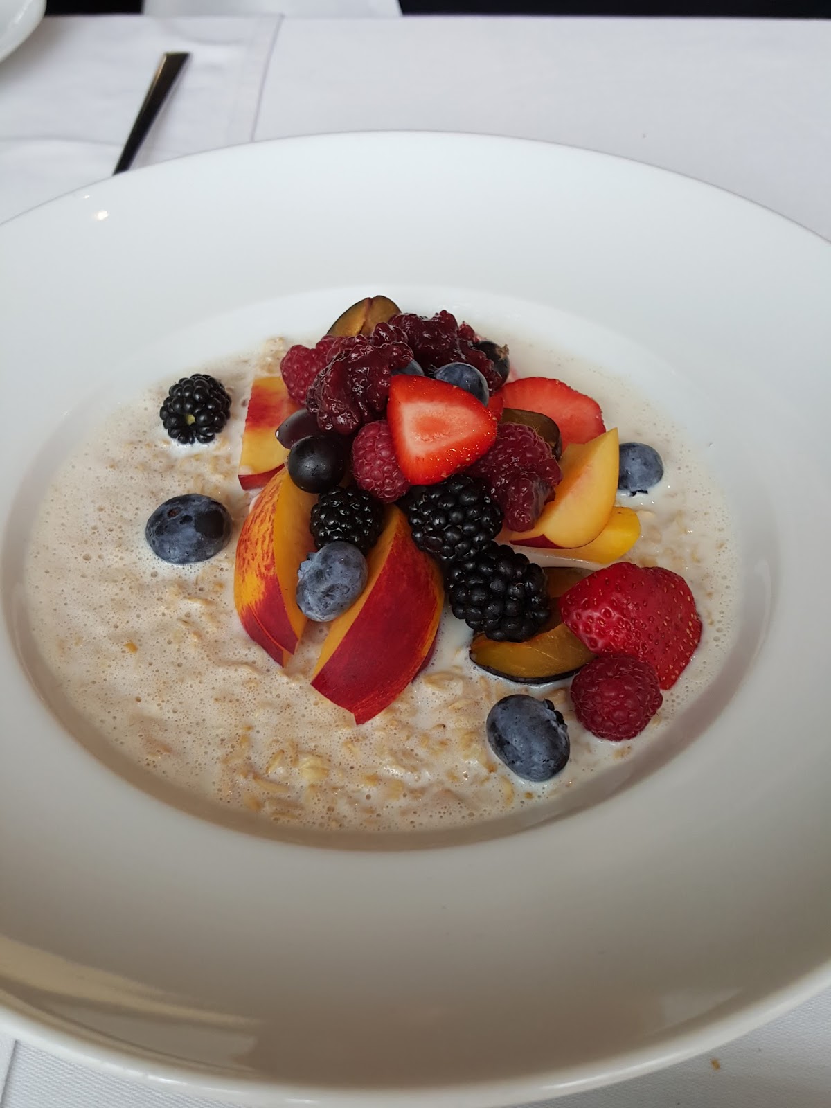 A na zakończenie i zwieńczenie tej śniadaniowej uczty – owsianka na krowim mleku ze świeżymi owocami (12,00). Aż się M łezka w oku zakręciła od tego smaku dzieciństwa. Tak to już jest, że nasz gust kulinarny kreowany jest od pierwszej łyżeczki dziecięcej strawy i choć zmienia się z wiekiem to skojarzenia smaku potraw i pozytywnych chwil pozostają w nas na zawsze. Mi ciepła owsianka na mleku kojarzy się z zupą mleczną z kożuchem podawaną w przedszkolu – do dzisiaj mam traumę na widok i zapach ciepłego mleka.
