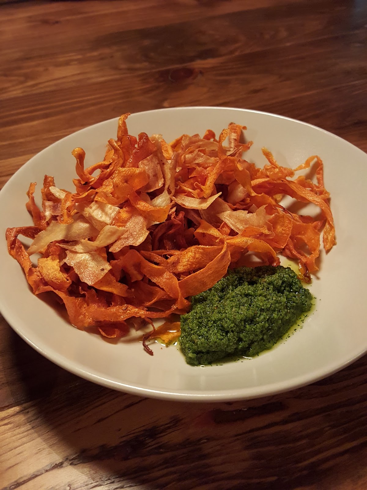 M zaszalał tego dnia – na start zamówił warzywne chipsy z ziołową pastą (14,00) – widocznie miał ochotę na chrupiące witaminy. Smaku temu daniu ująć nie mogę ale jakoś nigdy nie traktowałam go poważnie – bardziej jako dodatek do czegoś, na przykład do piwa.