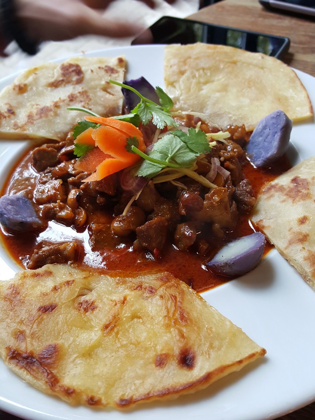M wybrał Matsaman curry z wołowiną (39,00) z fioletowym ziemniakiem, orzechami, nasionami lotosu oraz plackami roti. Mięso bardzo rzadko gości na talerzu M – czasami skusi się na coś wyjątkowego właśnie z wołowiny. Ta wersja matsaman curry była niezwykle aromatyczna, głęboka w smaku, nawet placki szybko zniknęły z talerza. Musiało smakować.