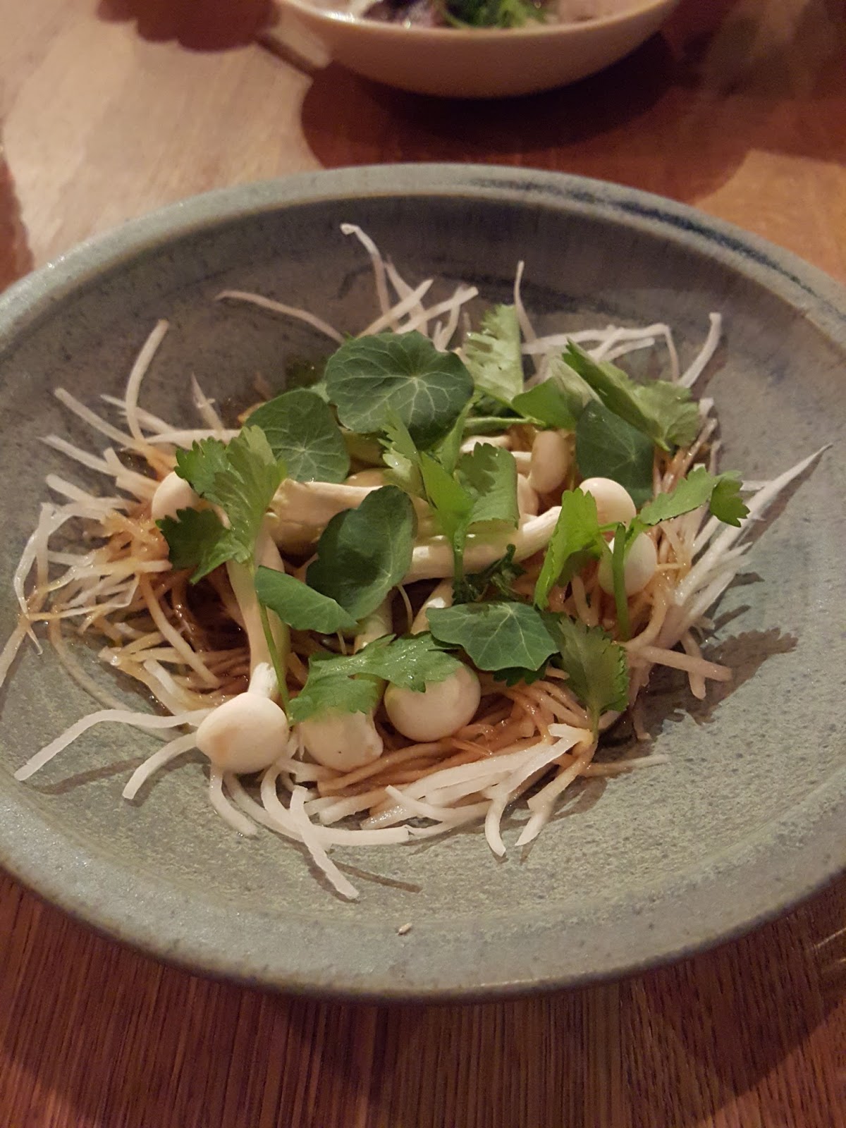 Przyszliśmy na ramen więc i na nim się skupiamy. Na start zamawiamy sałatkę z Hatifnatów z grzybkami enoki i rzepą (23,00) – niezwykle delikatną oraz orzeźwiającą i rzeczywiście enoki przypominają w niej ludziki z Muminków. M spróbował śledzia w kawie i wasabi (25,00) – już bardziej wyrazistego i głębokiego w smaku. Polecam spróbować jak jeszcze będzie.
