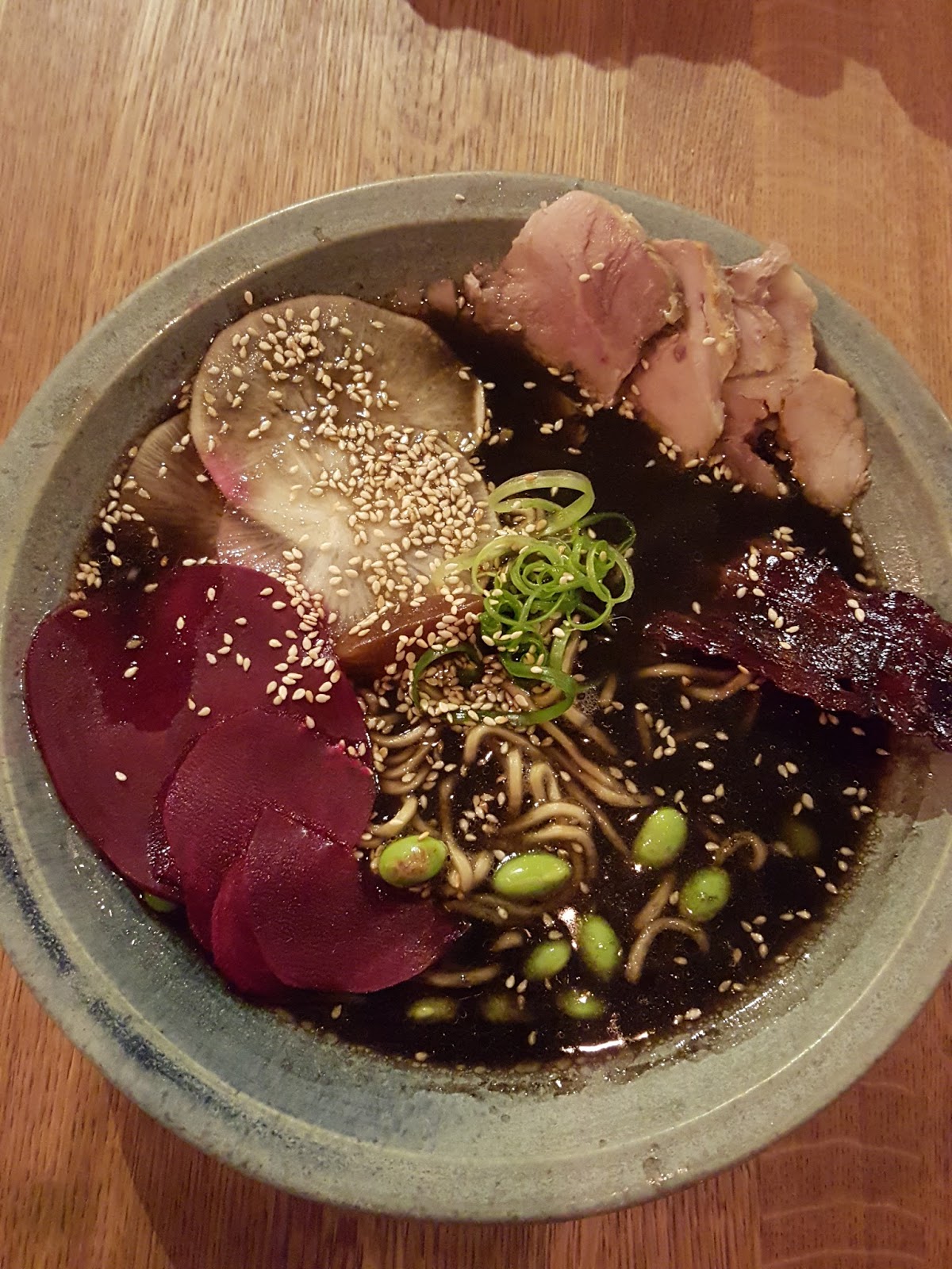 Przyszedł i czas na ramen – namówiłam M na osławiony już czarny ramen (35) z wieprzowiną, taro z czarnego czosnku, sepią, szpikiem, sezamem, węgierkami, edamame, burakiem i alkalicznym makaronem. I ku mojemu zdziwieniu zachwytu nie było. Może dlatego, że mój ramen grzybowy (32,00) był dużo bardziej esencjonalny i wyraźny niż ten mięsny. Znalazłam w nim grzyby shitake, boczniaki, uszaki, enoki, pieczarki, kremowe jajko, jarmuż, daikon, cebulę, sezam, taro z grzybów, wywar dashi i alkaliczny makaron – same smakołyki. Nad tym ramenem mogłam się zachwycać i jeżeli będziecie się zastanawiać nad wyborem to zdecydowanie polecam grzybowy.