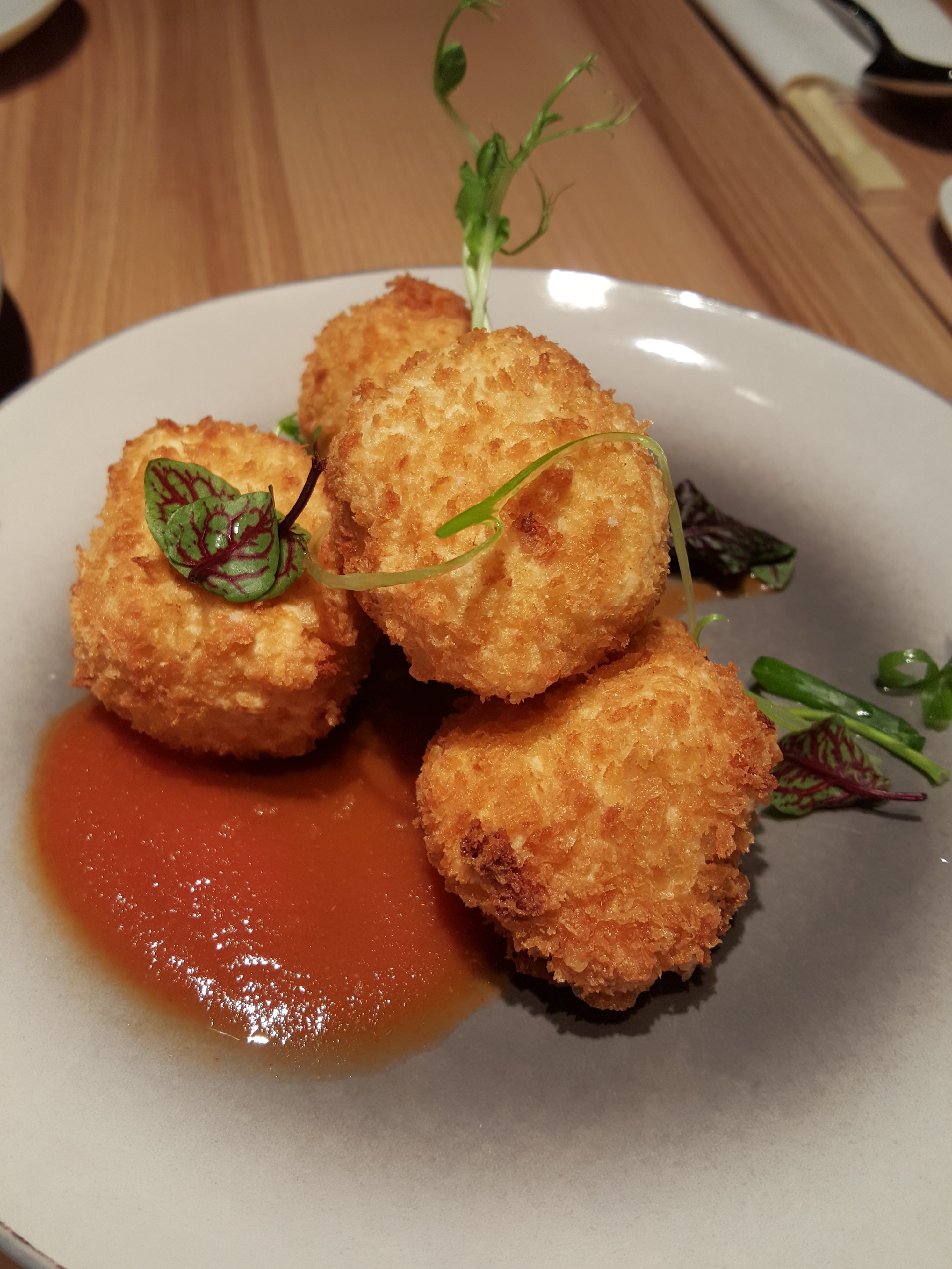 Korroke (15,00) to krokiet z nadzieniem z krewetek – lekko mdły w smaku, zyskuje po zamoczeniu w słodkim sosie. Polecam uważać na tą przystawkę podczas jedzenia – płynne nadzienie lubi tryskać przy ugryzieniu – na szczęście ja strzeliłam nim w miskę obok a nie w bluzkę albo w M.