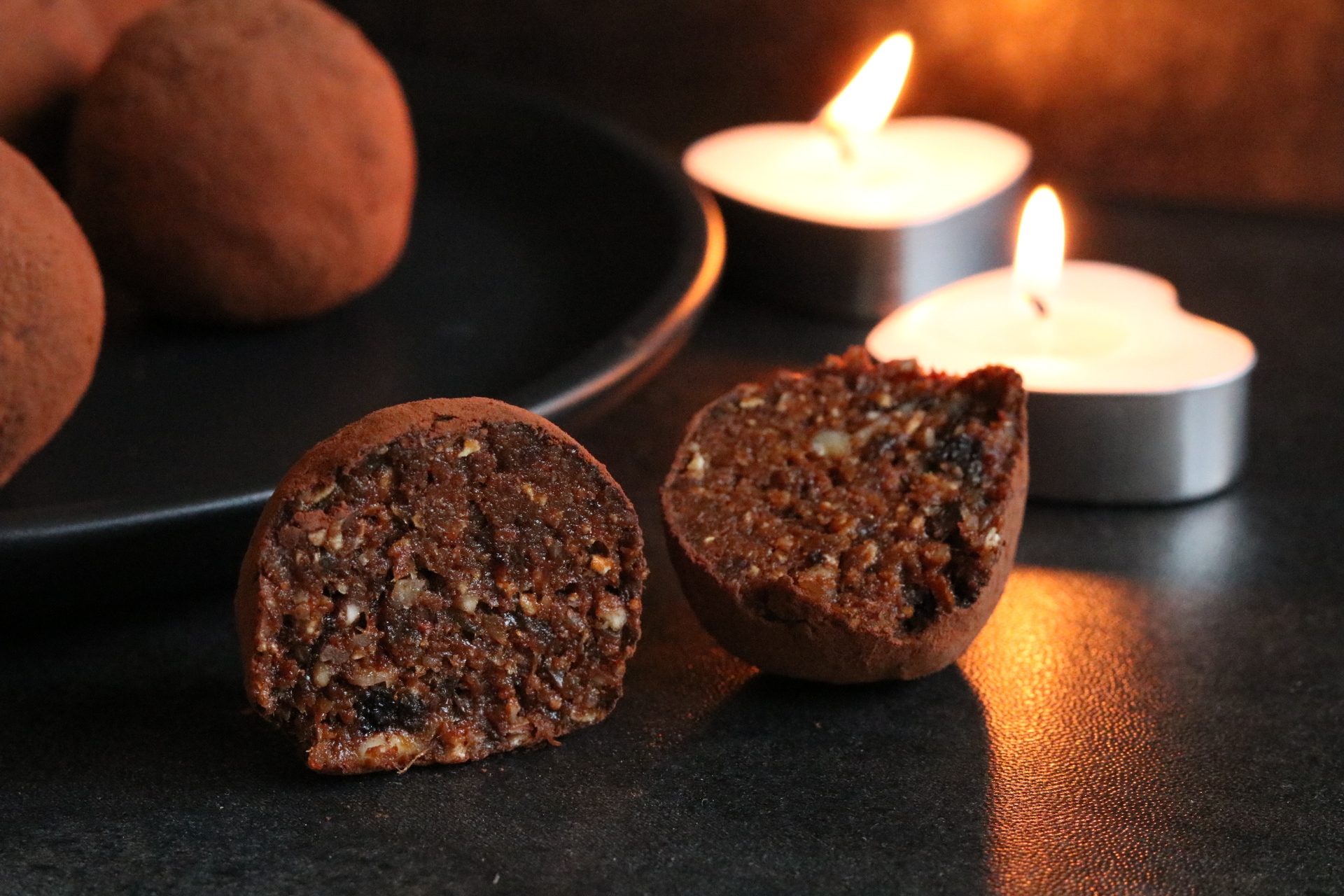 Suszone daktyle i śliwki zalewamy wrzątkiem na około 10 minut. Odcedzamy je i miksujemy z pozostałymi składnikami na gęstą masę. Kawałki orzechów powinny być w niej wyczuwalne. Z masy formujemy niewielkie kulki i obtaczamy je w gorzkim kakao a następnie chłodzimy w lodówce, w zamkniętym pojemniku, przez minimum 2 godziny. Po tym czasie trufle są gotowe do podania.