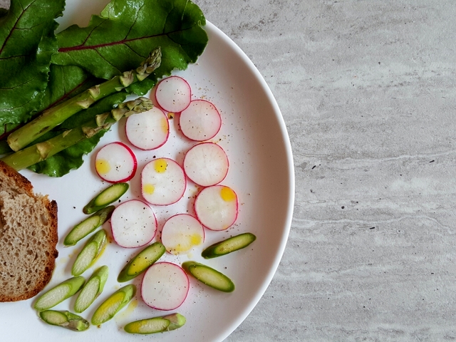 Akurat miałam ochotę na taką prostą kompozycję – świeże szparagi pokrojone w plasterki a do tego kilka podanych w całości, chrupiąca rzodkiewka skropiona olejem lnianym oraz soczyste i wyraźne w smaku liście buraka ćwikłowego (botwina). Do tego żytni chleb i nic mi więcej do szczęścia wiosną nie potrzeba.