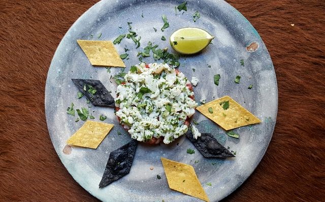 3 Chorty to trzy czarne tortille z owocami morza (41,00) – z przegrzebkami w lekkiej salsie z awokado, ananasa i ogórka, krewetkami podanymi z majonezem chipote i ośmiorniczką w salsie picada. Nie mamy jeszcze wyrobionej manualnej techniki zjadania takich placków bez ochlapania się sosem na wszystkie strony – ale tu utaplać się warto bo to bardzo smaczne sosy są (i farsz też).
