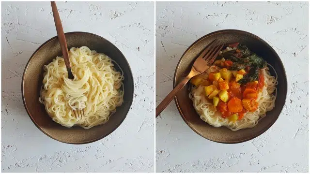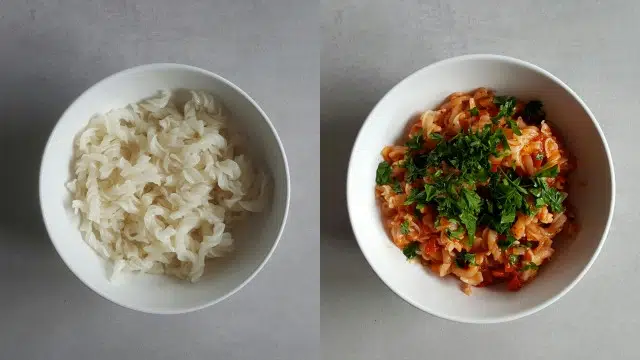 Tu nawet nie musicie wcześniej podsmażać cebuli – wystarczy wszystko pokroić i wrzucić do garnka lub na głęboką patelnię. Po 5-10 minutach warzywa będą gotowe i można je podać do makaronu.