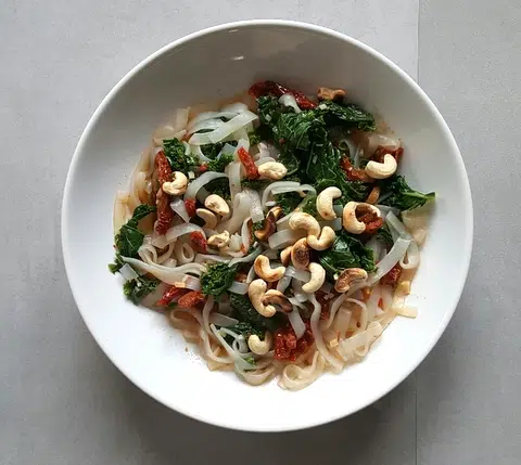 bezglutenowe makarony – konjac w kształcie fettuccine podany z suszonymi pomidorami. jarmużem, czosnkiem oraz nerkowcami