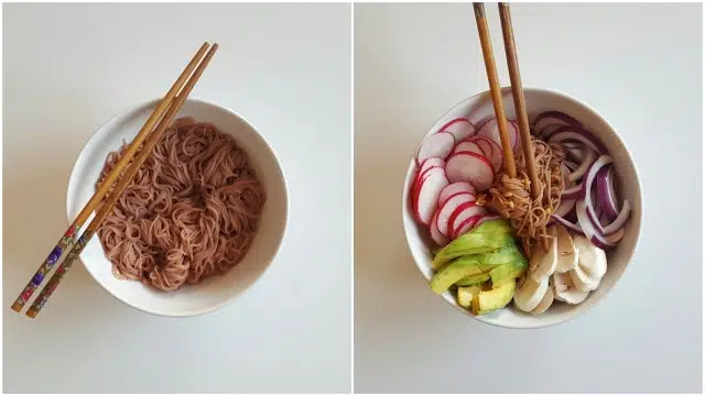 To danie jeszcze prostsze w wykonaniu. 100g makaronu gotujecie tak jak producent wskazał na opakowaniu i przelewacie zimną wodą. Nitki z ciemnego ryżu będą bardziej wyraźne w smaku od białych. W małym naczyniu rozrabiacie sos (6 łyżek sosu sojowego, 1 łyżka sosu rybnego, 1 łyżka octu ryżowego lub jabłkowego). Makaron przekładacie do miski, zalewacie 1/2 sosu (na jedną porcję) a pozostałe świeże składniki to już Wasza inwencja twórcza. Ja do swojej miski wrzuciłam rzodkiewkę, awokado, świeże pieczarki oraz sparzoną czerwoną cebulę. Taka jest mniej ostra w smaku. Możecie jeszcze dodać – surową paprykę, ogórka, pomidorki, marchewkę, sałatę, jarmuż, szczypiorek czy jajko ugotowane na twardo.