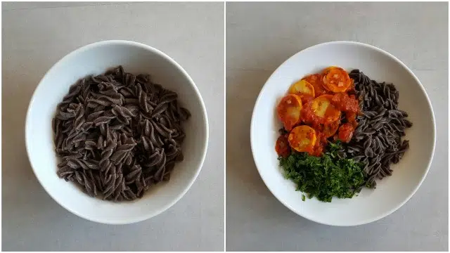 Wynalazłam takie cudo jak czarny makaron gryczany świderki BIO – w 100% ekologiczna razowa mąka gryczana. Prawie jakbym jadła samą mąkę gryczaną bo tak smakował a przez to był mało przyjemny w odbiorze. I tu znowu – sos z punktu 5 uratował mój obiad a do niego bardzo dużo posiekanej natki pietruszki.