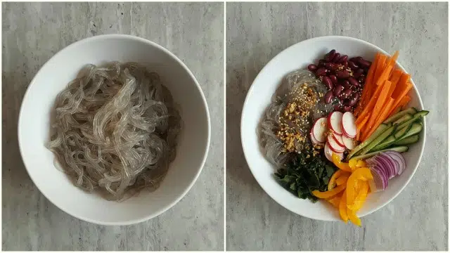 Podobny jest do makaronu sojowego – cienkie przezroczyste nitki bardzo sklejają się nawet po zlaniu ich zimną wodą. Polecam od razu makaron zalać sosem bo inaczej będziecie jedli zbitego gluta. A ta propozycja podania to nic innego jak sos z pkt 2 i inne warzywa posypane prażonym sezamem. Coś czuję, że takie michy wejdą do mojego stałego menu tej jesieni. Tu w misce znalazły się – czerwona fasola (z puszki), świeża marchewka, ogórek, papryka, rzodkiewka i cebula oraz glony wakame.