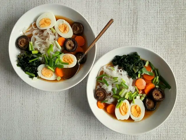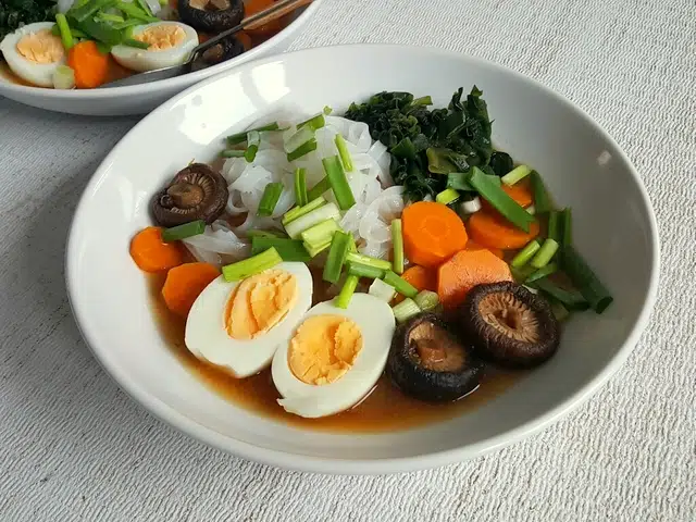 Jako dodatki możecie wrzucić już na talerz – tofu, makaron ryżowy, glony wakame, marchewkę z bulionu, szczypiorek, drobno pokrojoną cebulę, rzodkiewkę, grzyby z bulionu, prażony sezam a nawet ugotowane i pokrojone w kostkę ziemniaki.