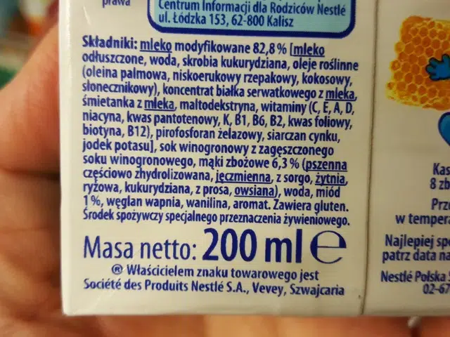 Kolejne mleko modyfikowane dla dzieci – a cukrami tutaj są: skrobia kukurydziana, maltodekstryna, sok winogronowy, miód.