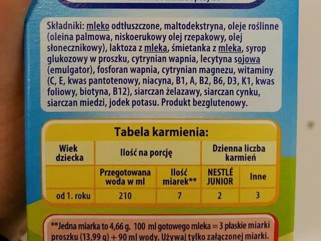 mleko modyfikowane w proszku dla dzieci. Maltodekstryna znajduje się tu na drugim miejscu w składzie. Oprócz niej słodzikami są jeszcze laktoza oraz syrop glukozowy.