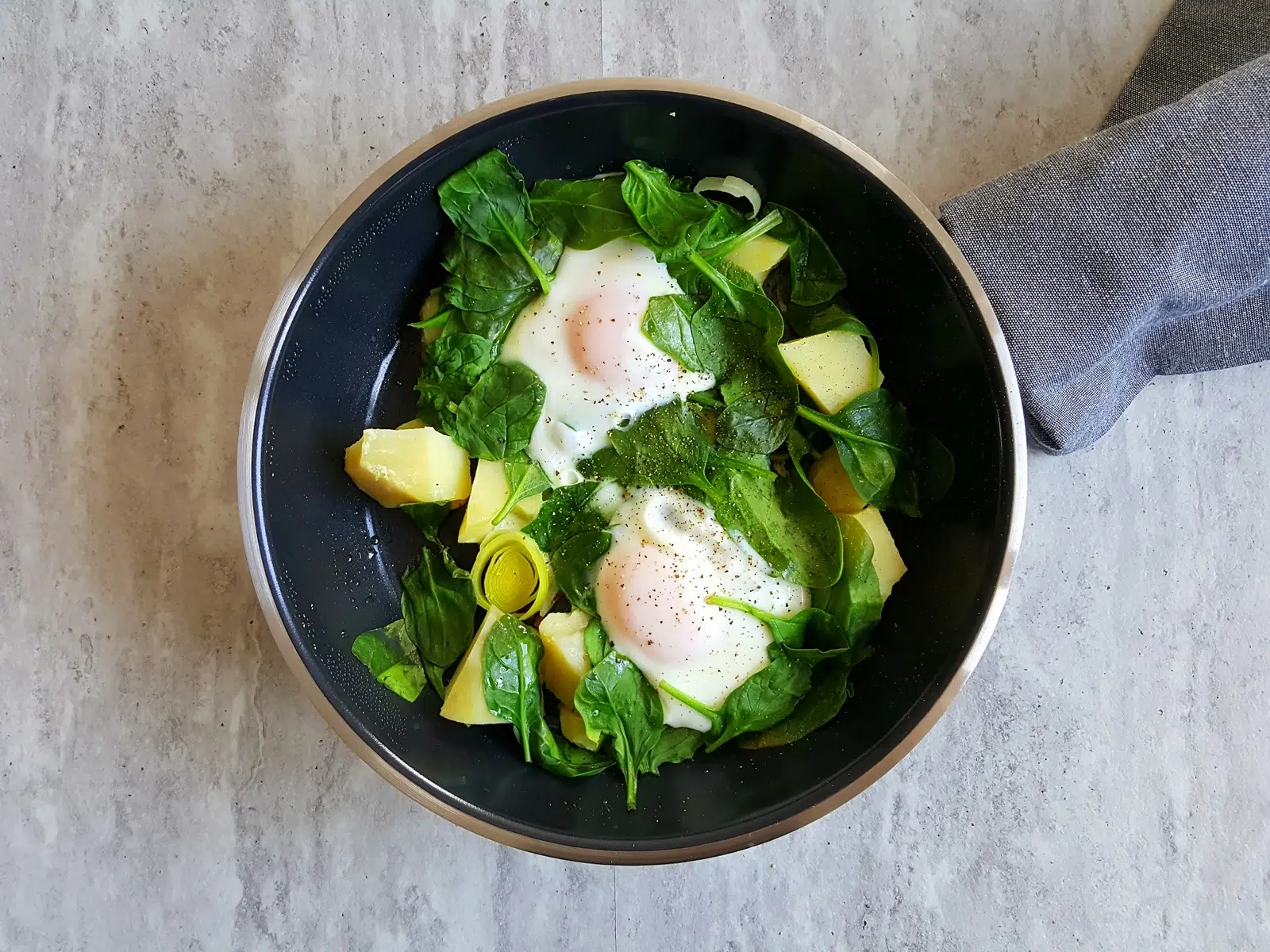 Jeżeli zostaną Wam z obiadu gotowane ziemniaki to macie gotowy, główny składnik kolejnego dania. Wystarczy dodać do nich kilka innych warzyw i wbić jajka.