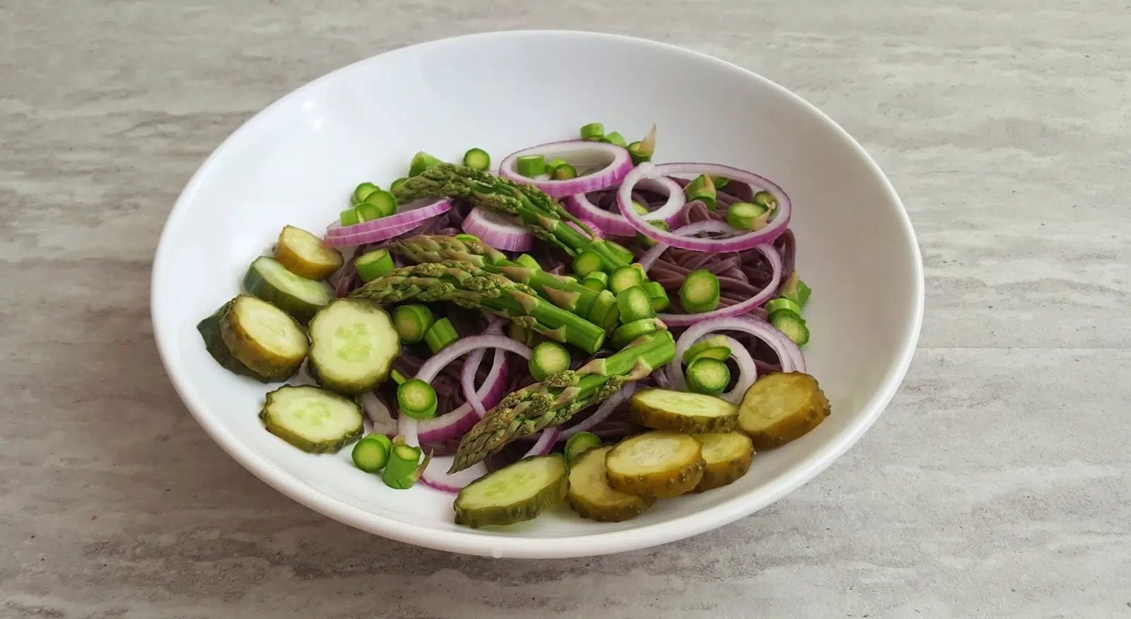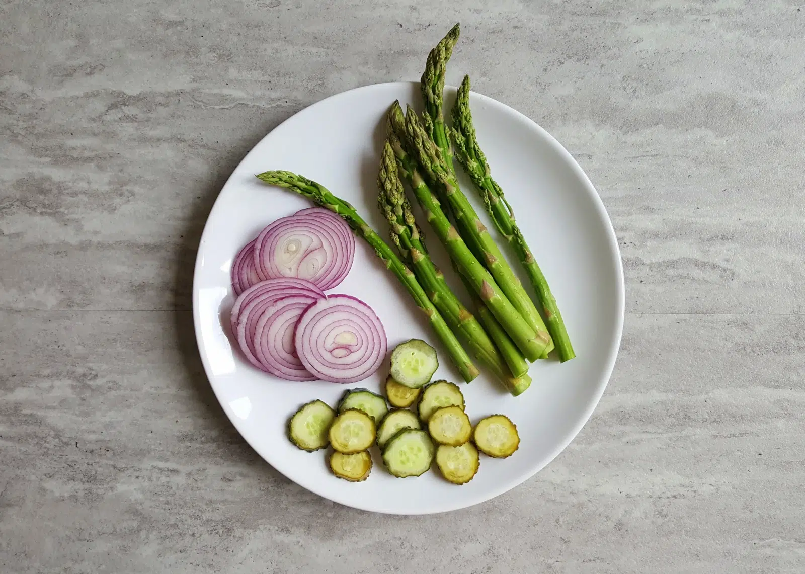 2. W tym czasie zdążycie pokroić ogórka w plasterki oraz sparzyć wrzątkiem cebulę oraz szparagi. Dodam tutaj, że ja sama uwielbiam jeść zielone szparagi i inne warzywa na surowo więc szparagów tutaj nie sparzyłam