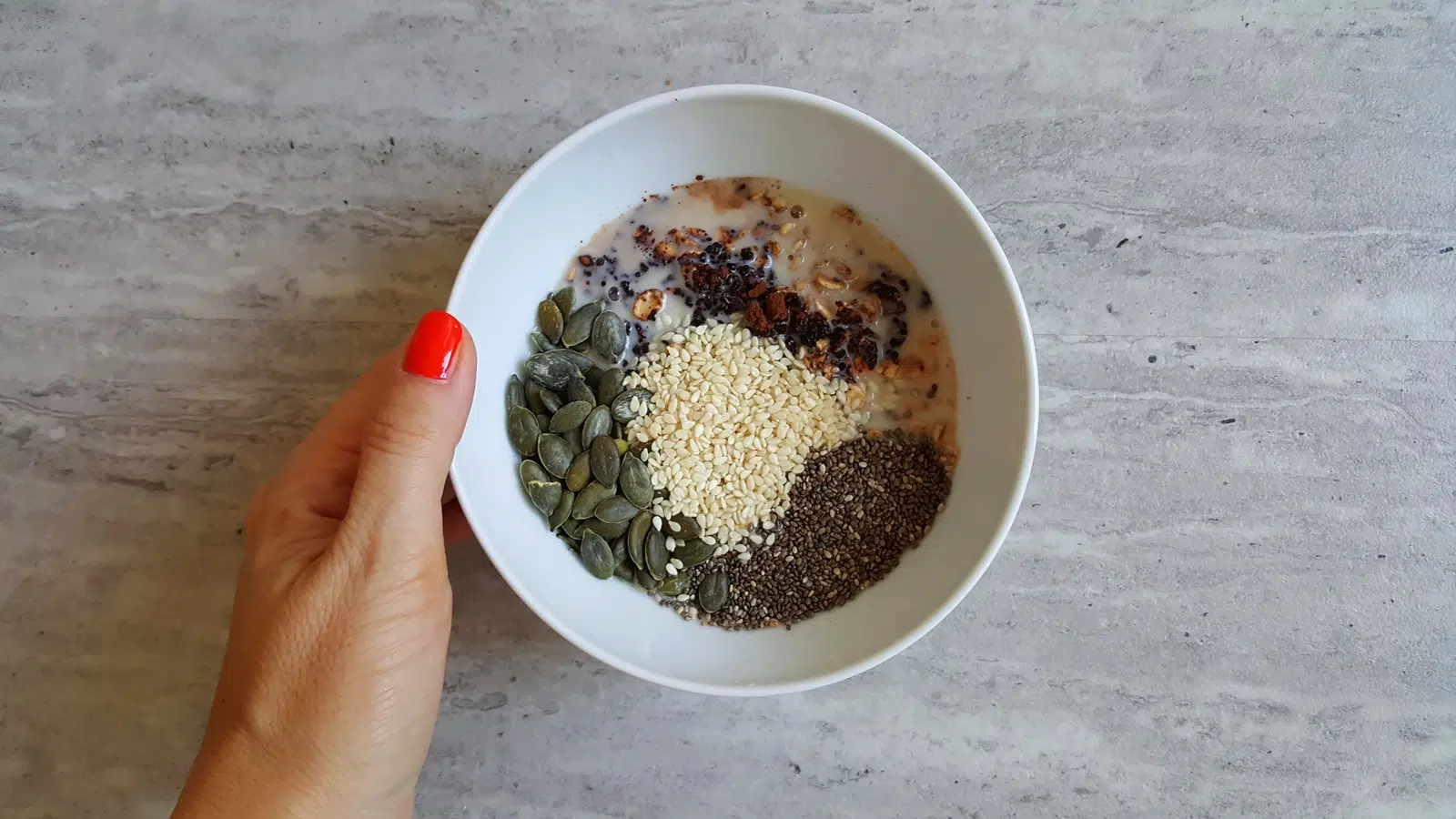 A oto prosty przykład na zjadanie wapnia czyli owsianka z fortyfikowanym mlekiem roślinnym, sezamem, pestkami dyni, chia i kakao