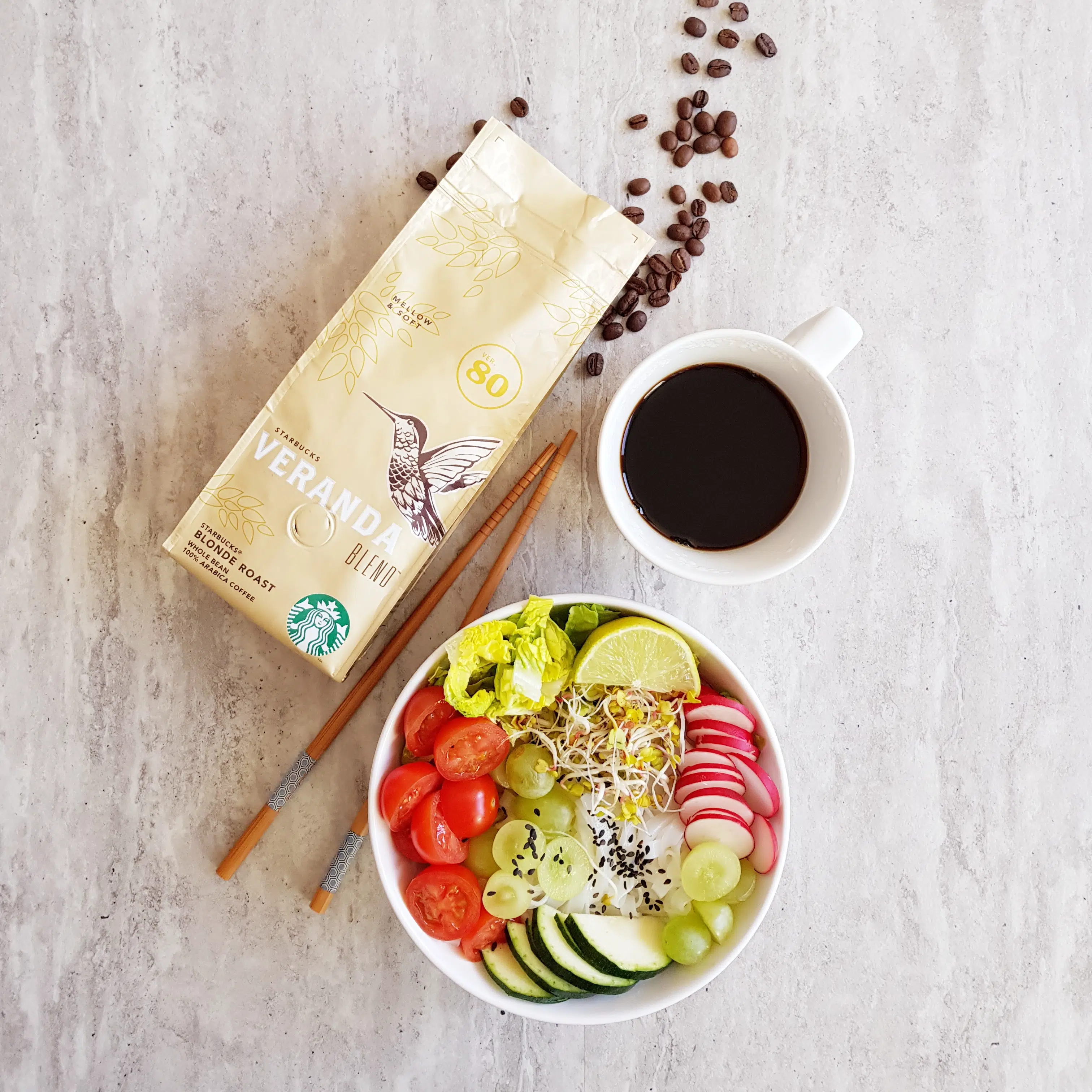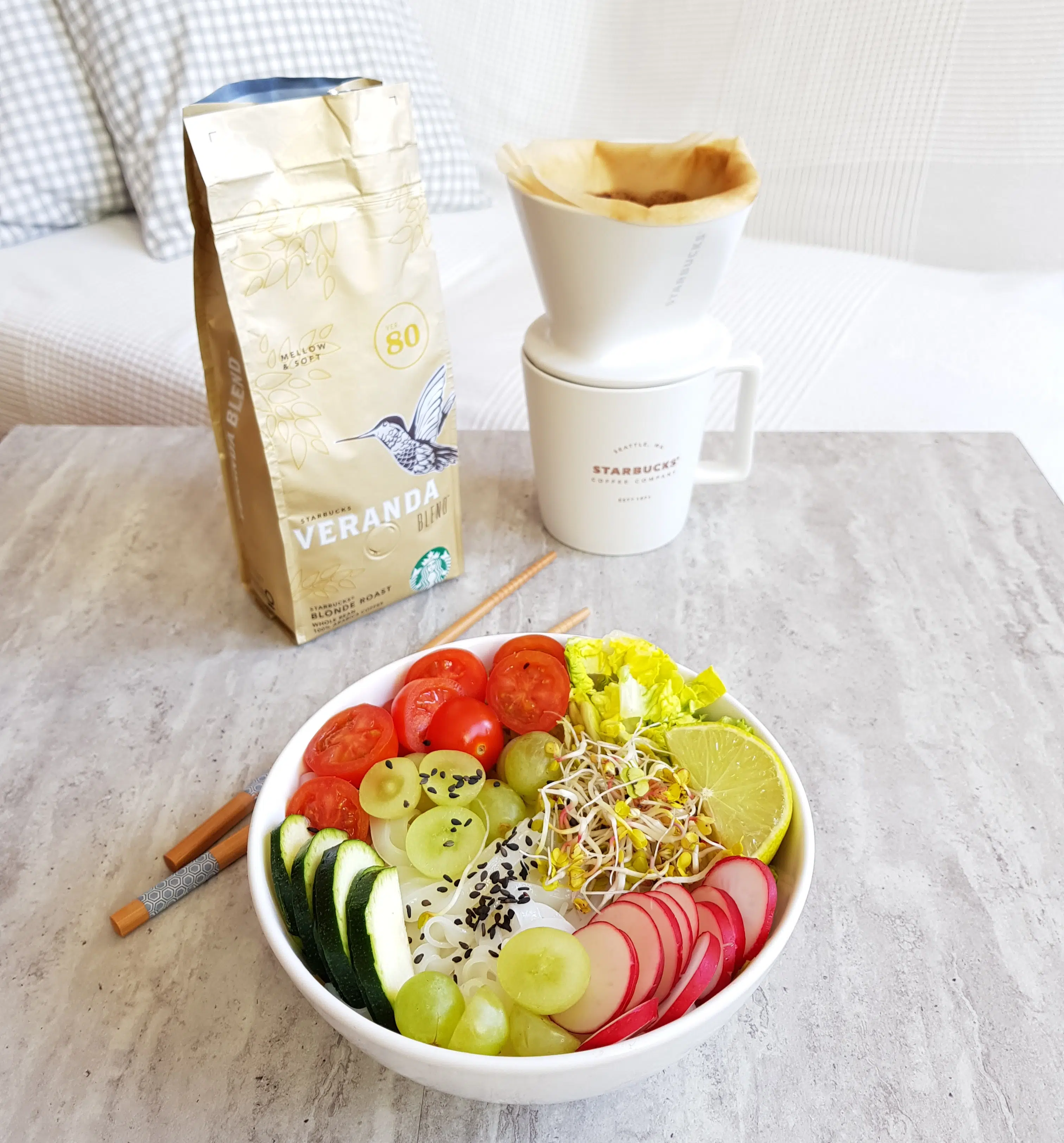 Kiedy przychodzi wiosna i lato jest już prawie za rogiem, nachodzi mnie ochota na lżejsze potrawy i jaśniejszą kawę. Nie mam tu na myśli kawy rozwodnionej tylko napój parzony z jasno wypalanych ziaren. Zobaczcie jak ta lekka, wiosenna sałatka z makaronem ryżowym sprawuje się w towarzystwie „blond kawy” zaparzonej w dripie, zwanym przeze mnie lejkiem.