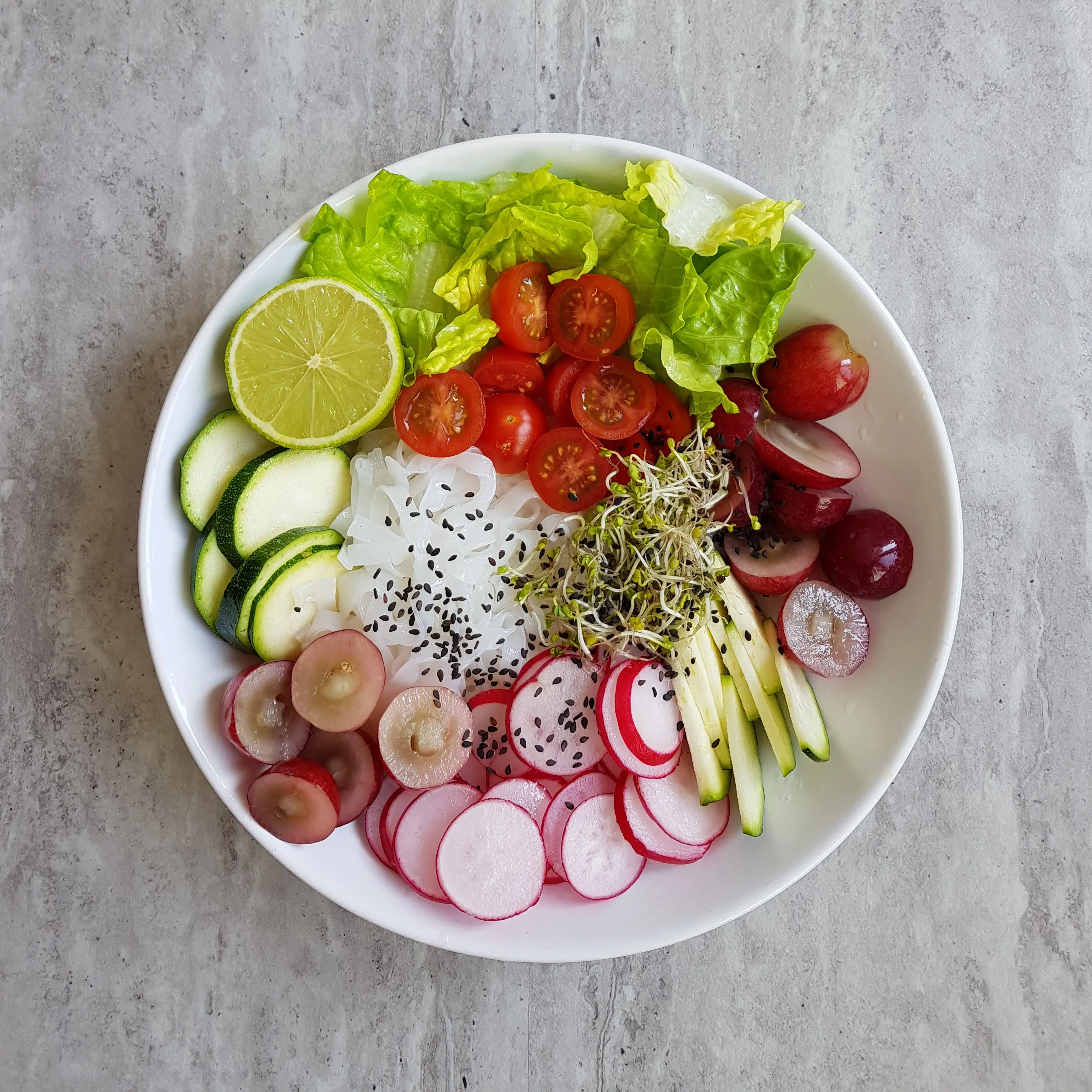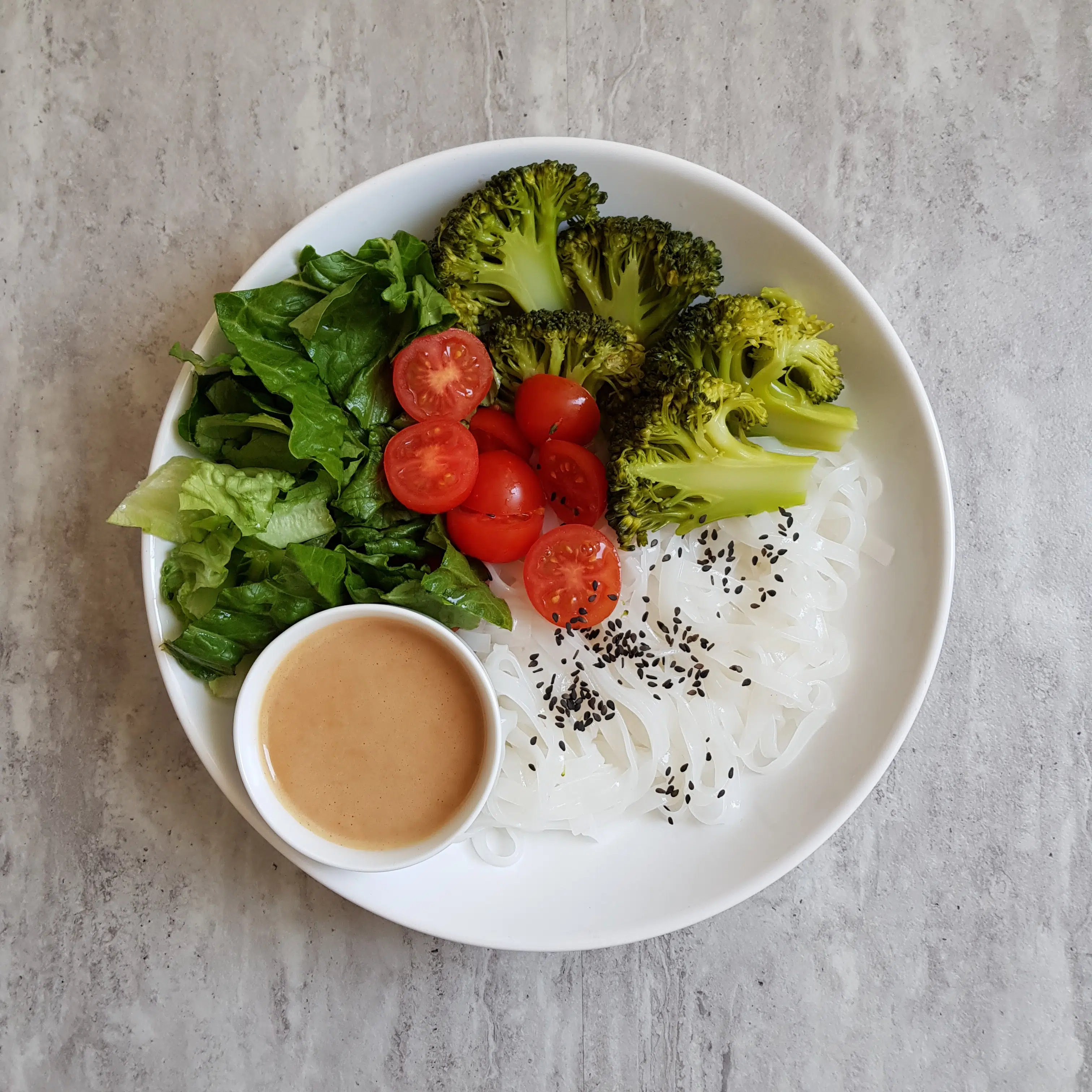 Makaron ryżowy, gotowane na parze brokuły, sałata rzymska, pomidorki, czarny sezam, sos z tahini