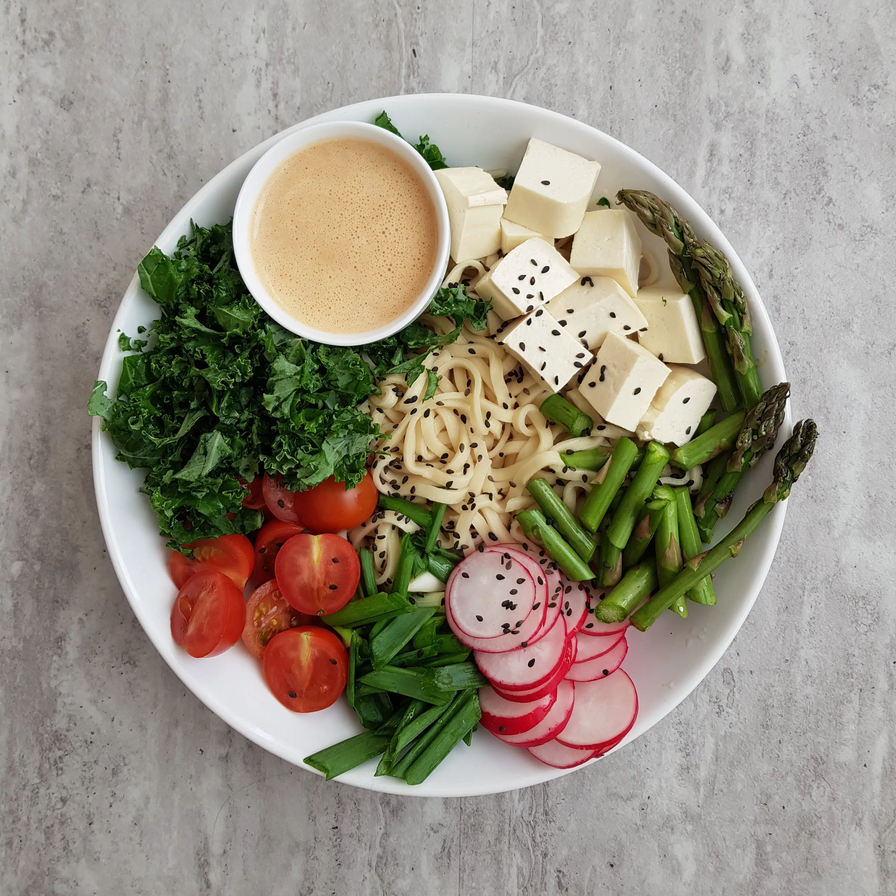 Tak – szparagi można jeść na surowo. Koniecznie spróbujcie. W tej misce widzicie makaron pszenny, tofu, jarmuż, pomidorki, szczypior, rzodkiewkę, sos z curry