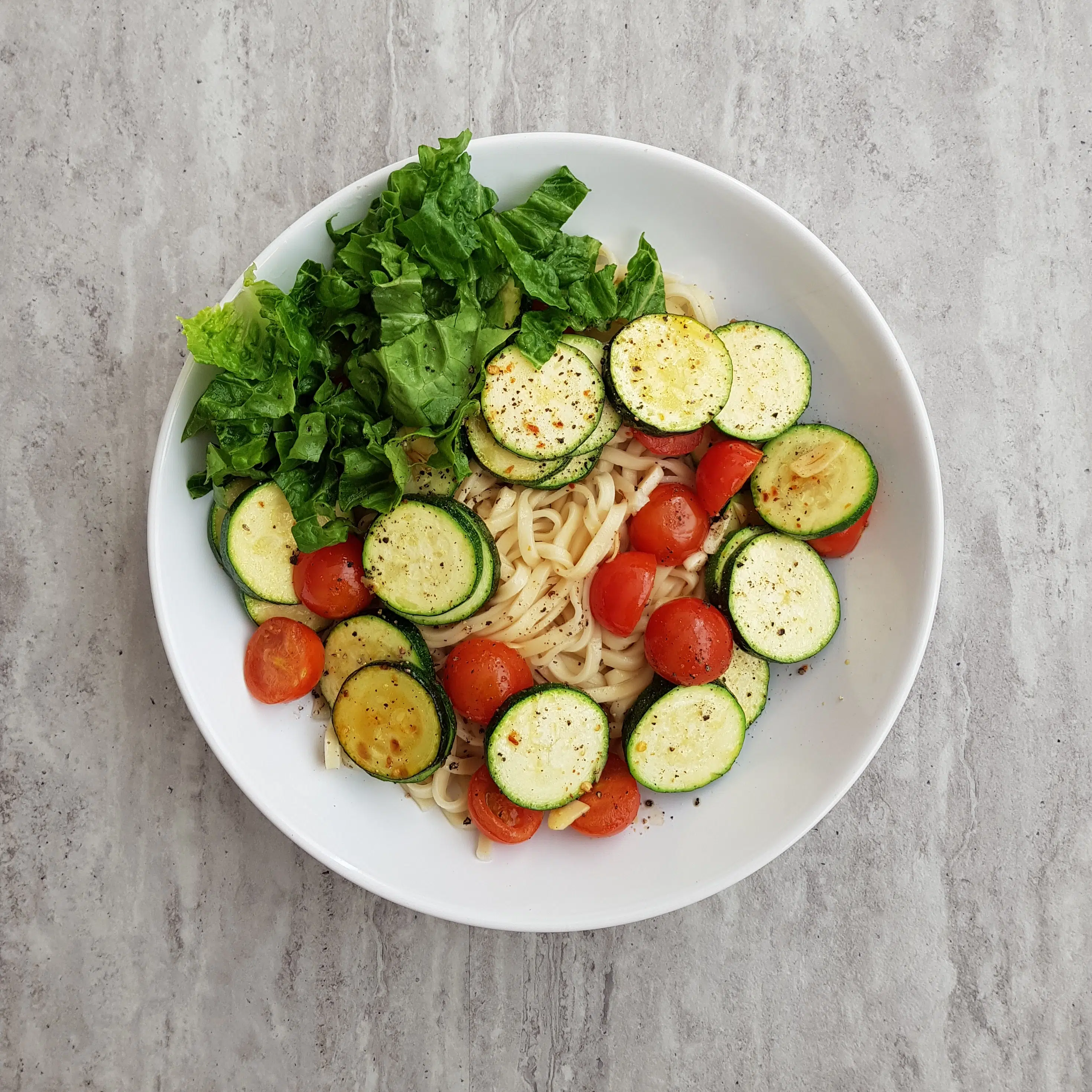 Tu podsmażyłam na patelni czosnek, szczyptę płatków chilli, 2 łyżki oleju rzepakowego, pomidorki cherry i plasterki cukinii. Przerzuciłam je na pszenny makaron i podałam z sałatą rzymską.