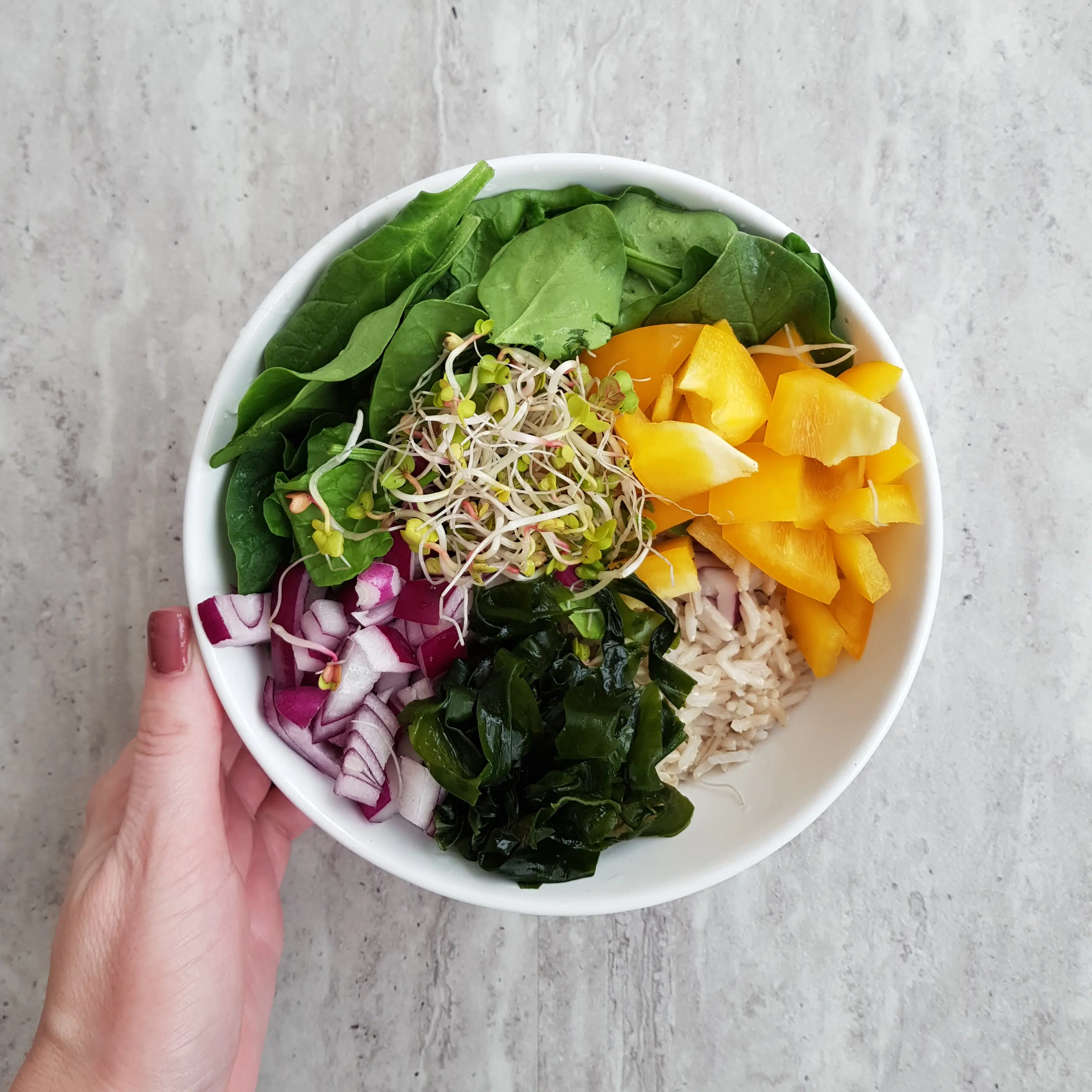 Szpinak, cebula, papryka, kiełki i wakame na brązowym ryżu polane olejem sezamowym i skropione cytryną.